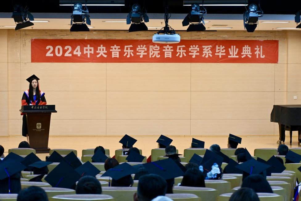 本科毕业生代表杨其睿结合自己在音乐学专业的学习经历与感想,以及对于音乐学系学风、学统的个人思考,探讨了他心中“央音音乐学系的光芒”。杨其睿特别感谢音乐学系浓厚的学术氛围和追求真理的学术风尚,他鼓励同学们在未来的人生中继续带着这一份优秀的传统前行,并表达了对大家真心的祝愿和期许。