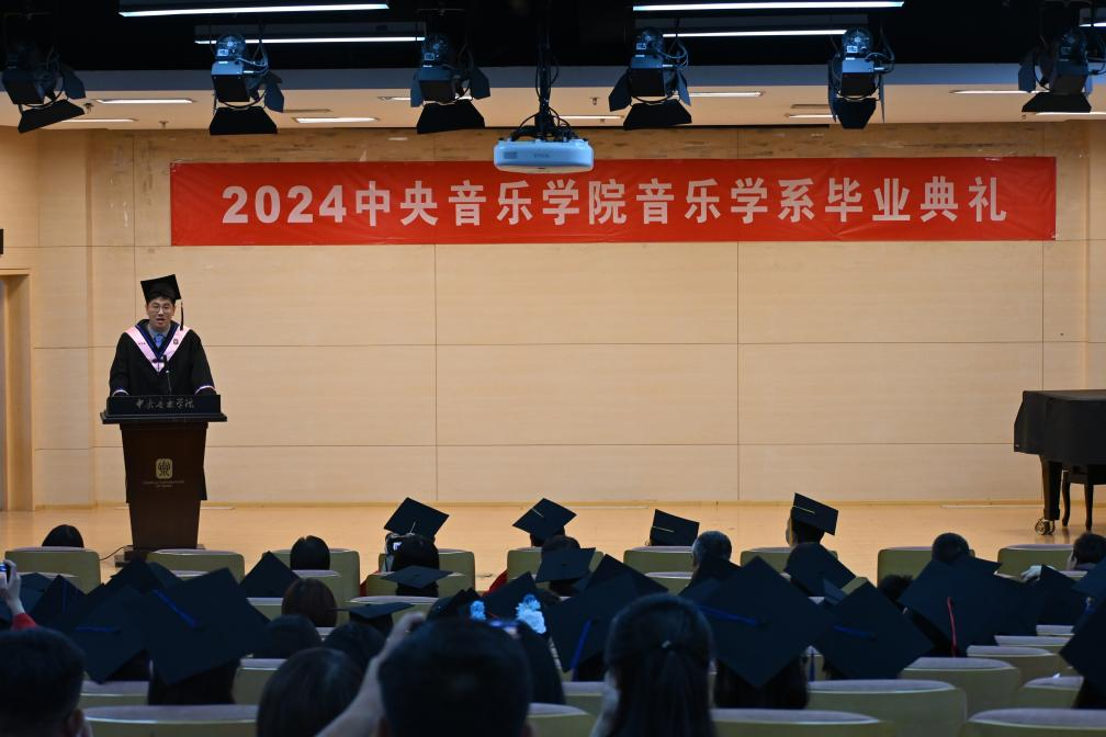 在欢快的氛围与热烈的掌声中,毕业典礼正式拉开帷幕。音乐学系系主任何宽钊用亲切的口吻向毕业生们表达了关怀、期许和祝福,他从学生们生活中点点滴滴的心迹谈起,从学生面临毕业所最为关切的问题和不舍心态出发,向同学们诉说了母校母系对于他们的牵挂。在致辞中,他引用了唐代诗人高适“莫愁前路无知己,天下谁人不识君”的豪迈诗句来展望毕业生们的未来,他指出,学校学到的有形知识只是一方面,央音的气度,央音的视野、央音的格局,央音的精神品性将会对同学们产生更为深远的影响。进而,何宽钊主任对毕业生们提出四点期许:涵养深厚的家国情怀、加强辩证全面的深度思考力、保持终身学习的习惯和动力、理解包容具体而不可爱的人。