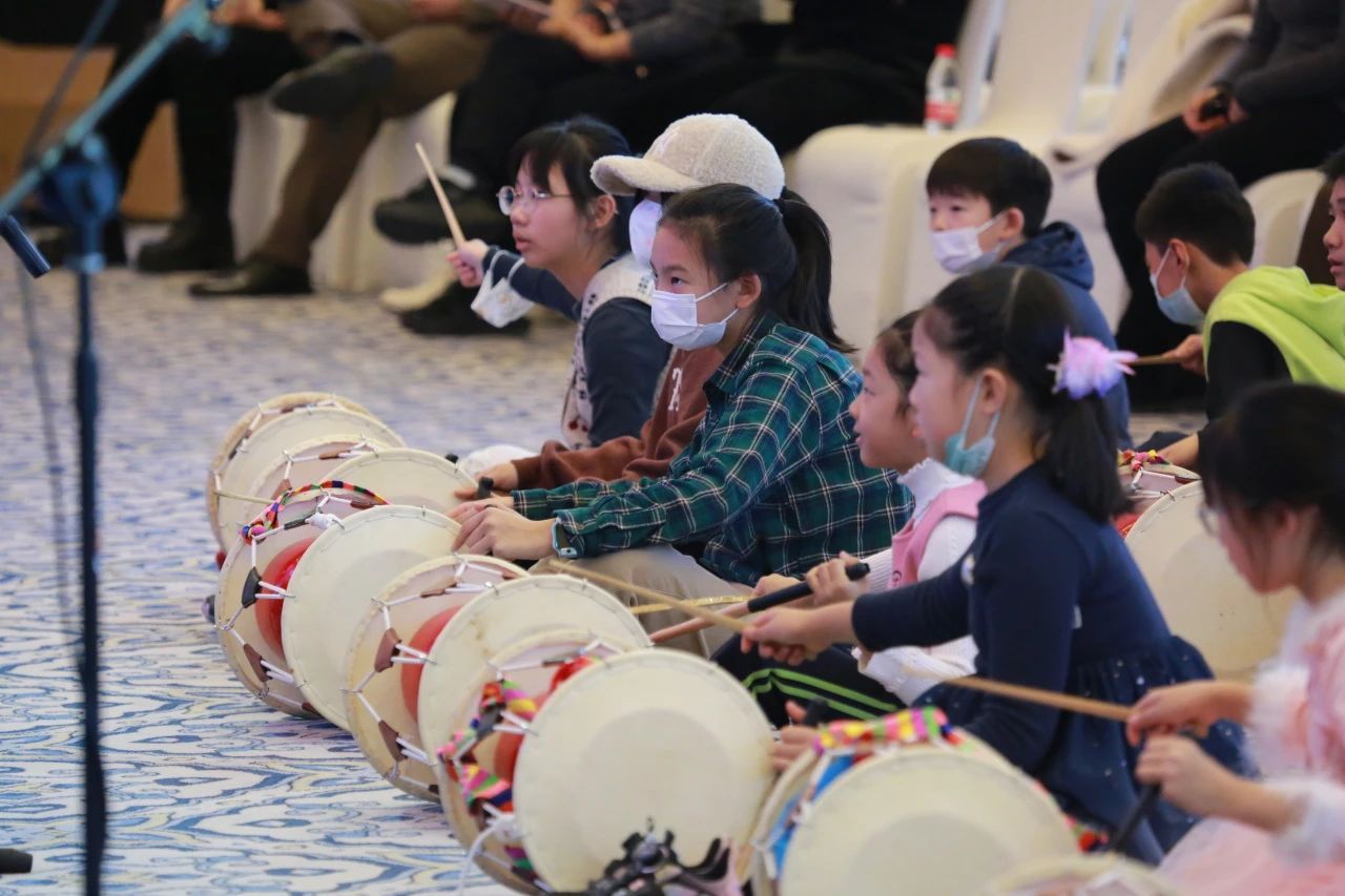 在工作坊的第二部分,权泰庆老师向学生及家长展示了韩国传统歌曲《阿里郎》以及大长今主题曲《呼唤(오나라)》,并邀请现场家长共同齐唱,学生以基本鼓点节奏进行伴奏,充分调动现场所有观众的积极性与参与度,引导家长与孩子共同参与音乐、表达音乐。