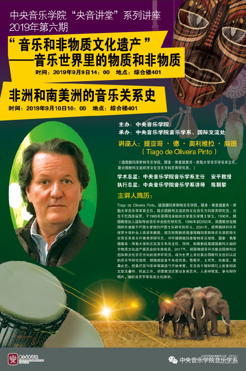 提亚哥 ·德·奥利维拉·频图教授(Tiago de Oliveira Pinto),德国魏玛李斯特音乐学院、耶拿·弗里德里希·席勒大学音乐学系系主任、联合国教科文组织跨文化音乐方向首席研究员。出生于巴西圣保罗,于1989年获得自由柏林大学音乐学博士学位。1990年,频图教授加入国际传统音乐学会担任研究员。1996年到2002年,频图教授在德国担任隶属于巴西大使馆的巴西文化研究所所长。2001年,频图教授担任圣保罗大学社会人类学系教授。现在频图教授是德国魏玛李斯特音乐学院跨文化音乐系系主任兼首席研究员,担任德国魏玛李斯特音乐学院、耶拿·弗里德里希·席勒大学的交互音乐系系主任。同时,频图教授是德国教科文组织非物质文化遗产委员会的专家成员。2017年,频图教授晋升为联合国教科文组织跨文化音乐方向的首席研究员,成为世界上首位联合国教科文组织认证的音乐学研究首席。频图教授多年来在巴西、葡萄牙、土耳其、东南亚、莫桑比克、坦桑尼亚和南非等国进行实地考察,并在各个国际期刊上发表相关文章及著作。除此之外,频图教授还策划各类艺术、人类学展览,参与制作唱片,组织音乐节等各类文化活动。