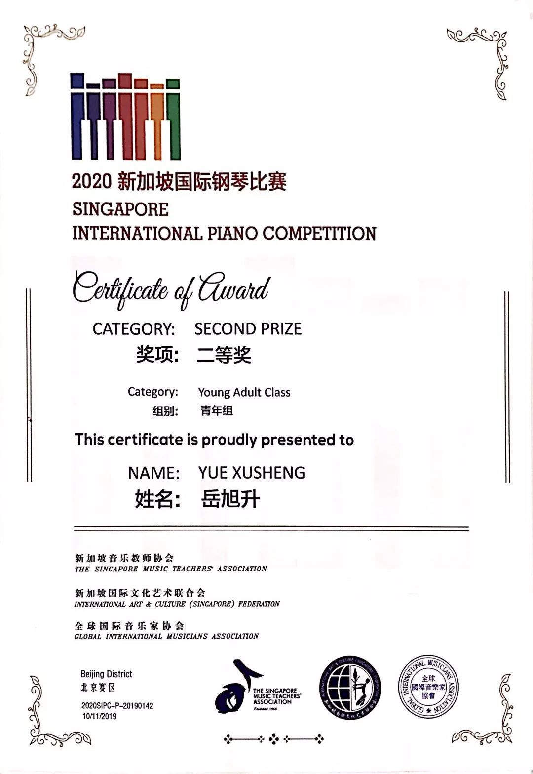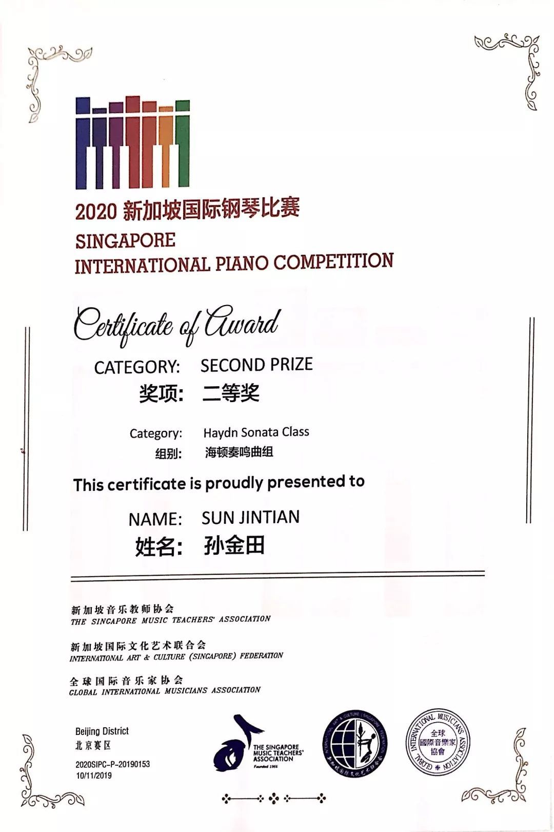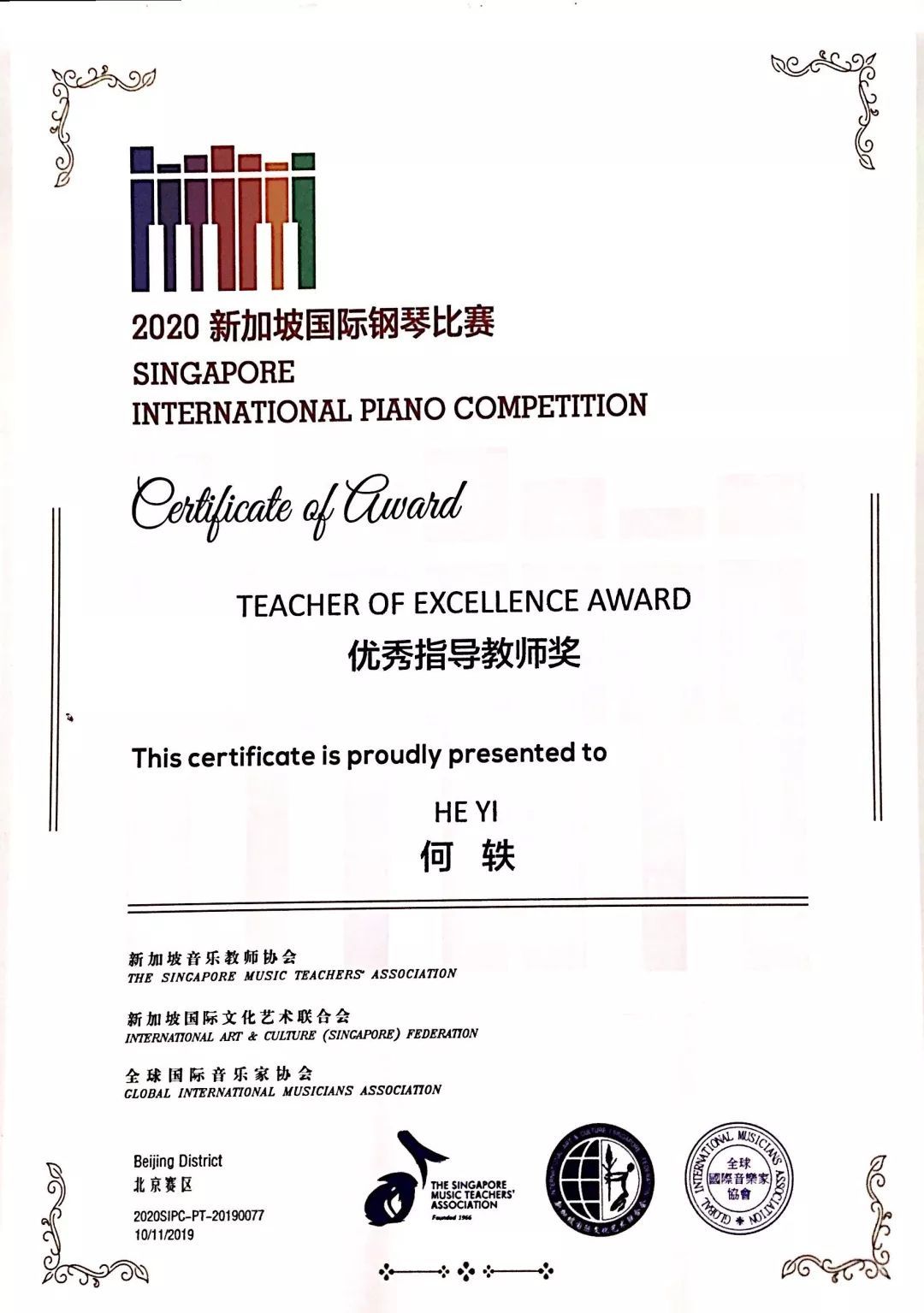 2019年11月3日——9日,在2020新加坡国际钢琴比赛(SIPC)北京赛区的比赛中,kaiyun官网钢琴系何轶副教授的音乐学系学生张蔚然、李雨唐荣获一等奖;孙金田、岳旭升、姜洛熙荣获二等奖;张天宁荣获三等奖;何轶副教授荣获优秀指导教师奖。