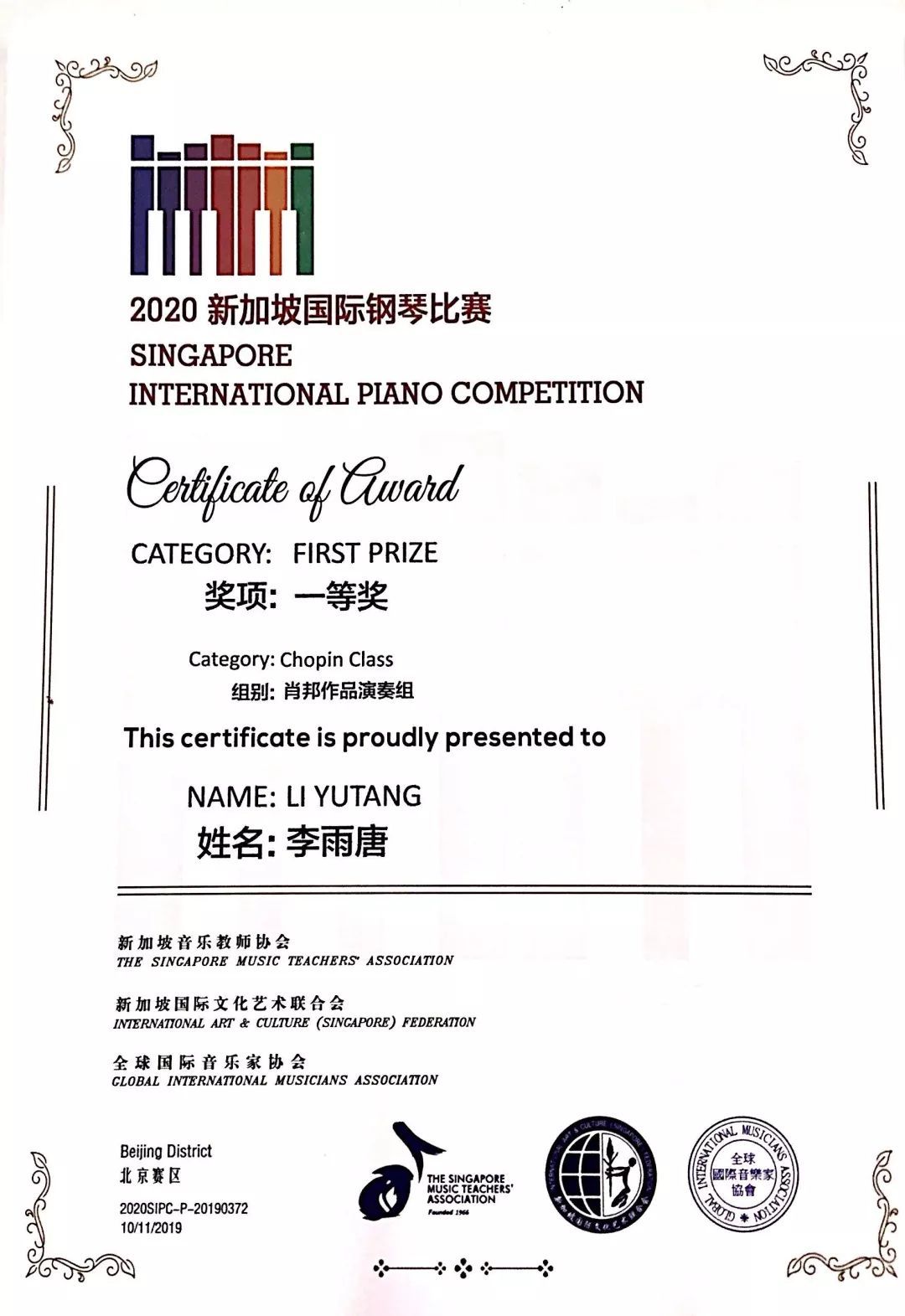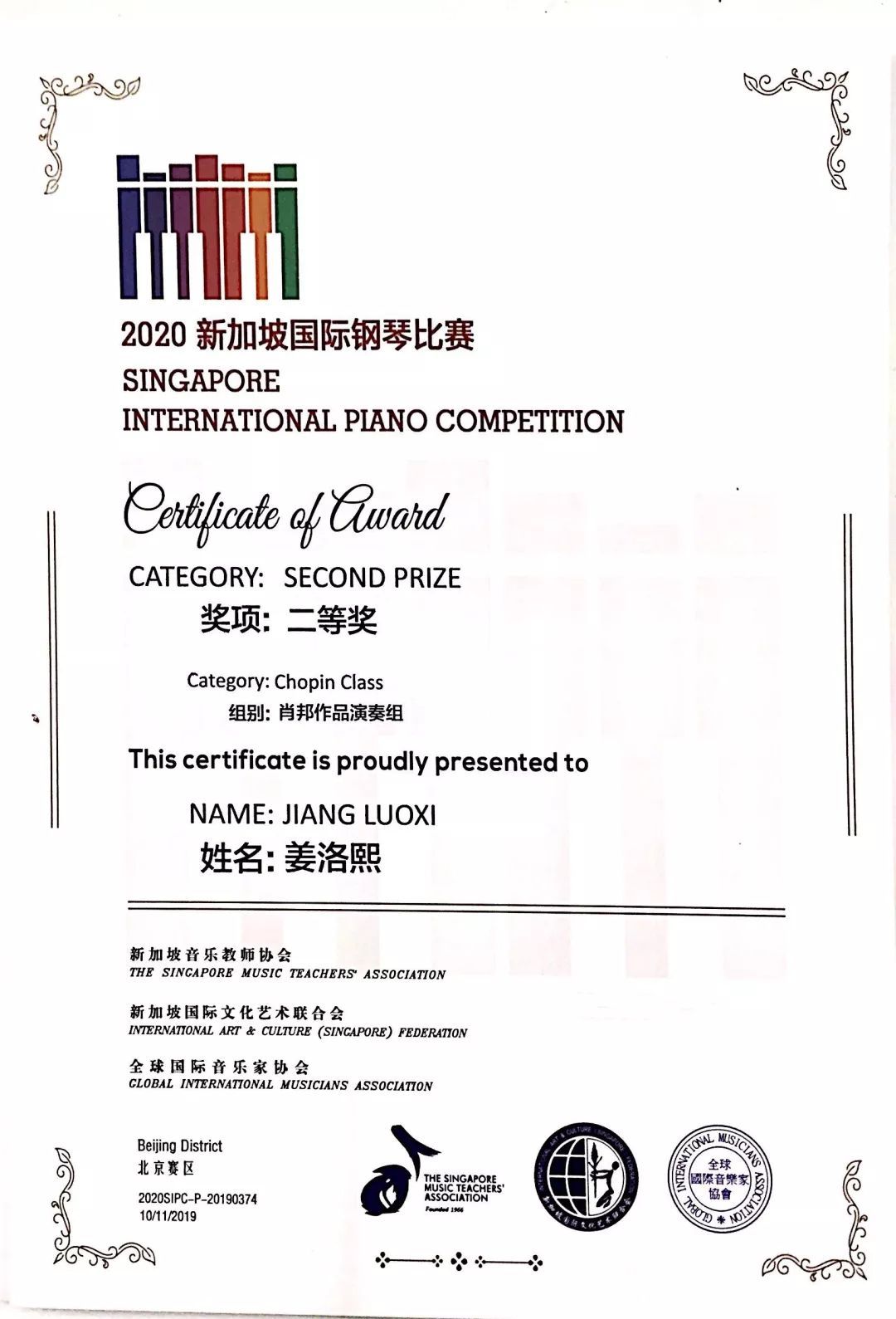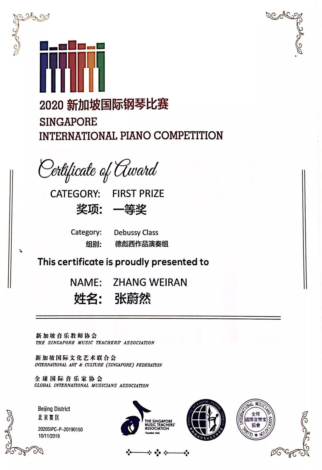 2019年11月3日——9日,在2020新加坡国际钢琴比赛(SIPC)北京赛区的比赛中,kaiyun官网钢琴系何轶副教授的音乐学系学生张蔚然、李雨唐荣获一等奖;孙金田、岳旭升、姜洛熙荣获二等奖;张天宁荣获三等奖;何轶副教授荣获优秀指导教师奖。