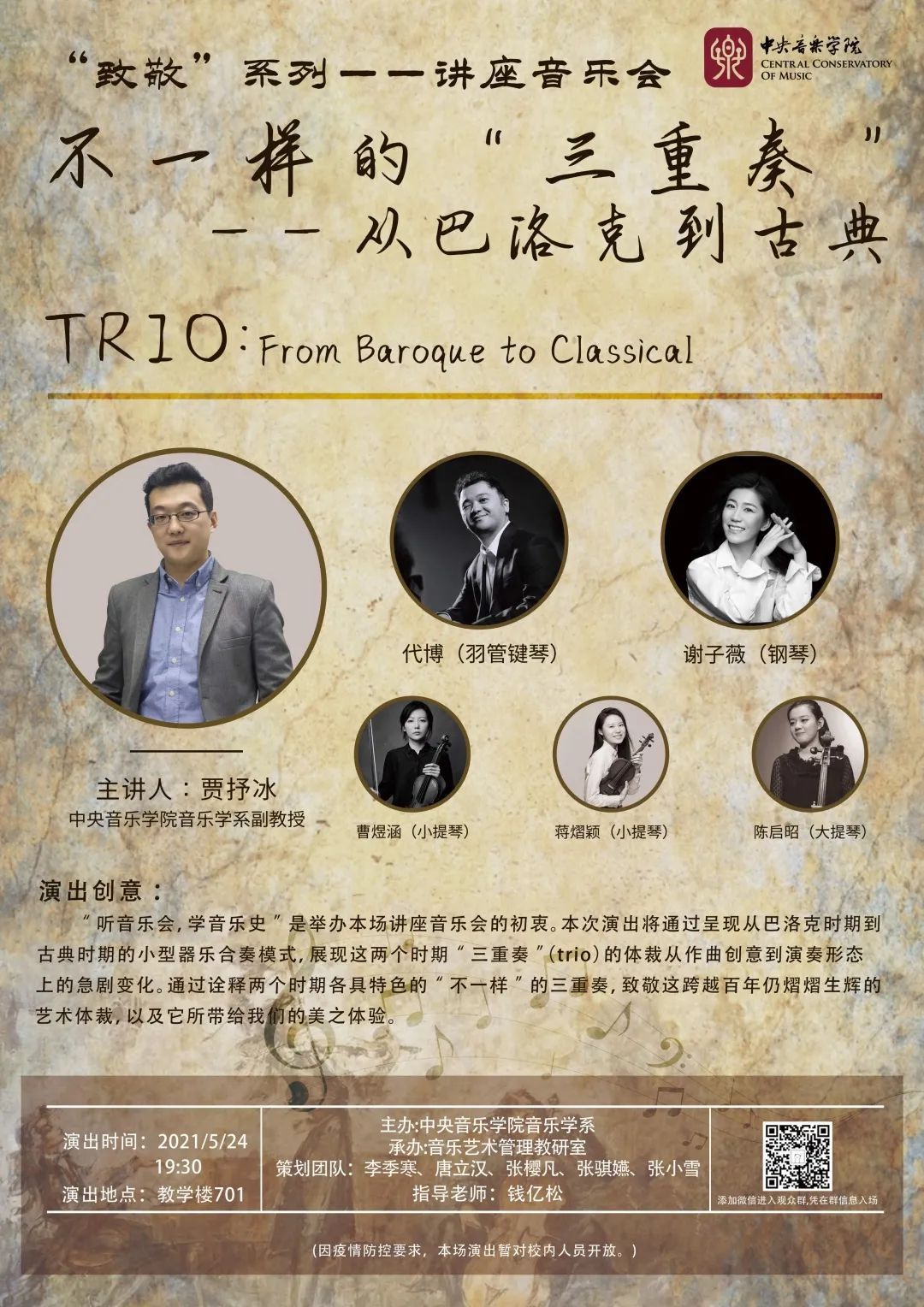 “听音乐会,学音乐史”是举办本场讲座音乐会的初衷。本次演出将通过呈现从巴洛克时期到古典时期的小型器乐合奏模式,展现这两个时期的“三重奏”(trio)的体裁从作曲创意到演奏形态上的急剧变化。通过诠释两个时期各具特色的“不一样”的三重奏,致敬这跨越百年仍熠熠生辉的艺术体裁,以及它所带给我们的美之体验。