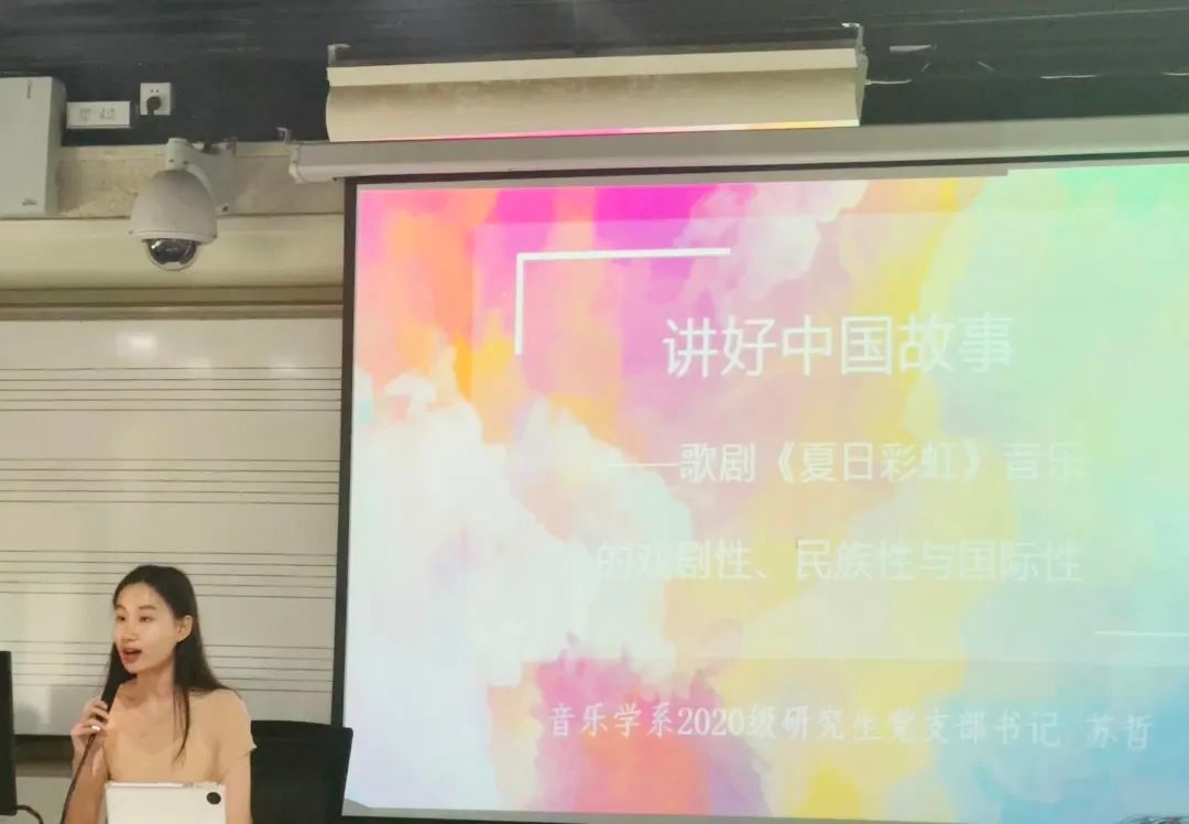 2020级研究生党支部书记苏哲从习近平总书记在党的二十大报告中的一段话谈起:“加快构建中国话语和中国叙事体系,讲好中国故事,传播好中国声音,展现中国可爱、可敬的形象。”她以作曲系郝维亚教授创作的《夏日彩虹》为例来阐述如何在歌剧中讲好中国故事,《夏日彩虹》如何传达音乐的戏剧性、民族性与国际性。