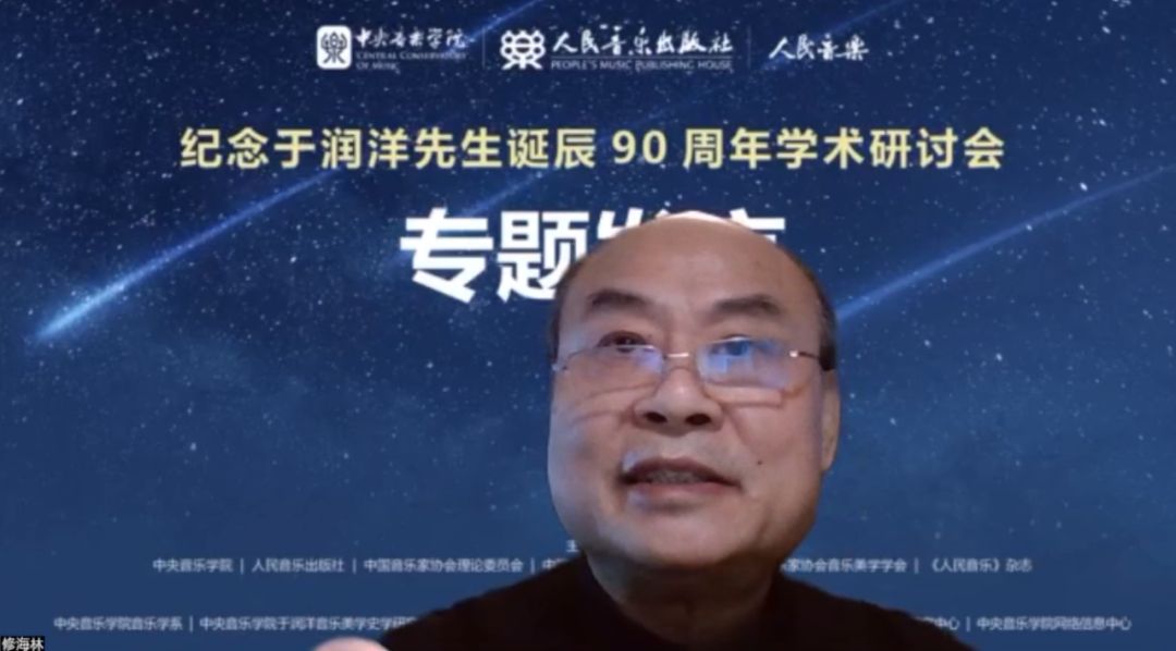 第七位发言者是修海林教授。他毕业留校,曾任学校音乐学研究所的所长,目前是中国音乐学院教授。 修海林的发言题目是《回忆于润洋先生的西方音乐史课》。他说,能上于先生的西方音乐史课程非常幸运。他回忆了第一堂课于先生对学科历史的梳理,强调音乐史作为音乐学基础学科的重要性。
