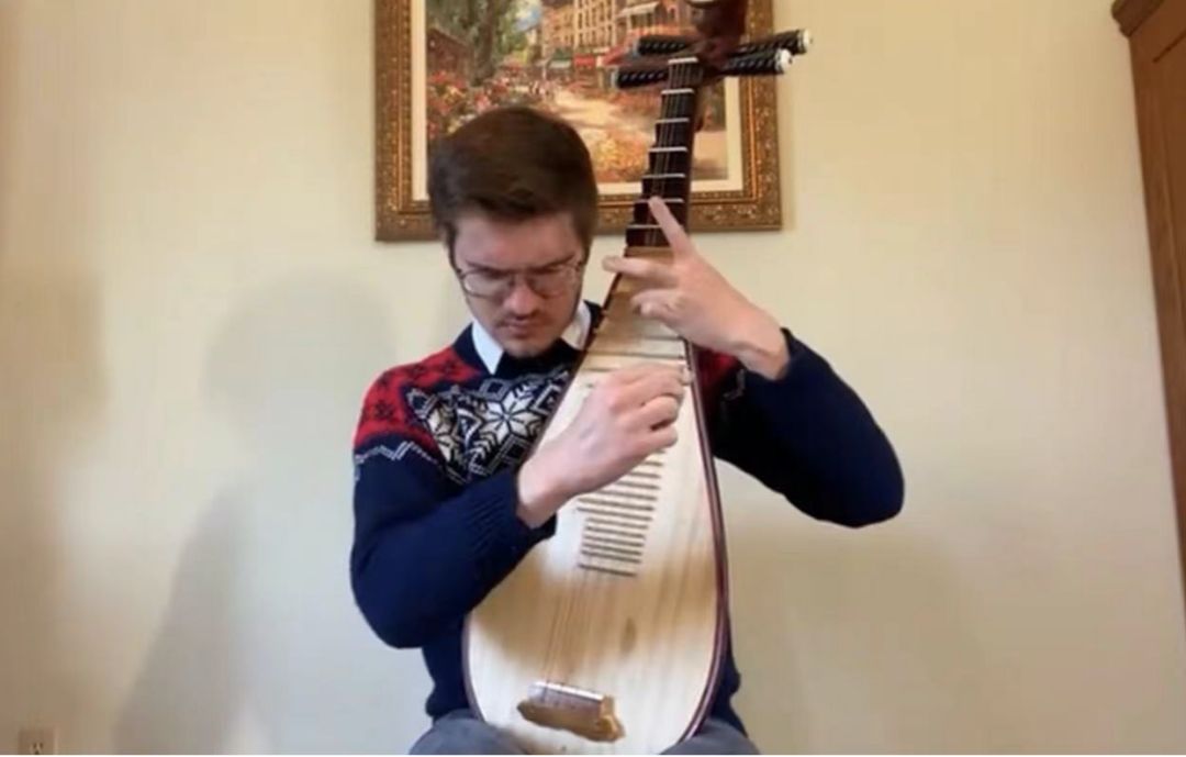美国加州大学伯克利分校民族音乐学在读博士研究生Gus Holley演奏的琵琶独奏曲《陈杏元和番》。这首作品是河南板头曲的代表作之一,由国乐泰斗林石城改编为琵琶独奏曲。Gus作为一名土生土长的美国人,却颇为地道地表现出了琵琶文曲的意韵。高虹老师分享了她和Gus的师生情谊,讲述了Gus接触、学习和研究中国音乐的经历,从刚接触中国音乐时的一见钟情,到开始学习中阮和琵琶,到成为第一名获得中国琵琶比赛金奖的外国选手。高虹老师还讲述了中国音乐近年来在美国的蓬勃发展。在对话的最后,安平教授感慨道:“如果能多一些像Gus这样的人,相信中国音乐一定能走向世界。”