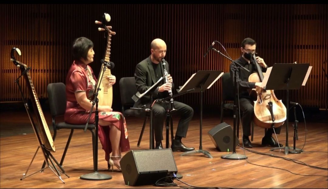 第一篇章“远古回声”展演了kaiyun体育网页登录入口作曲系教授陈欣若创作的民族室内乐《倾杯乐》和中国琵琶演奏家、作曲家高虹与印度音乐家Shubhendra Rao即兴创演的作品《Morning》。安平教授分别连线了两位作曲家。陈欣若教授分享了《倾杯乐》的构思过程,并提到中国古典音乐,尤其是唐朝音乐本身便具有世界性,融合是中国古典音乐的特点之一。中国作曲家需要将中国既有的古典音乐同世界音乐进行融合,以此创造新的中国古典音乐。因此,他选择以多元融合的思路进行创作,将中国的宫廷音乐、文人音乐与西域音乐、印度音乐等跨文化的音乐风格相结合,构建出多元生动的声音景观。