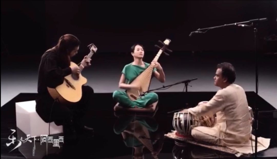 第三篇章“乐走天下”展演了三首风格迥异的作品。首先是由安平教授作曲、“乐走天下”世界赋寻乐队演奏的《阿西里西》。“赋寻”一词音译自英文“fusion”,即融合,“赋寻音乐”即混合音乐的代名词,本是印度音乐的一个种类,现泛指将本民族音乐结构和乐器与其他音乐形态相融合的音乐风格。《阿西里西》是一首根据贵州彝族古老民歌改编而成的中国赋寻器乐曲。彝语“阿西里西”的大意为“朋友们一起来玩游戏“,无独有偶,英文“Play”一词除了“游戏”的含义外,也具有玩耍和演奏等含义。由此,“阿西里西”的含义与“乐走天下”乐队以乐会友,融合创新的宗旨达成了融通。这首作品以“阿西里西”的民歌旋律为主题,结合中国、印度古典音乐以及当代赋寻音乐的即兴表演规则,通过琵琶、吉他和塔布拉鼓三件乐器的即兴变奏与插部交替演奏,象征着“中国、西方和世界”音乐文化的融合,既体现了彝族古老音乐的质朴与狂野,又彰显了中华传统音乐文化和世界音乐的和谐之美。
