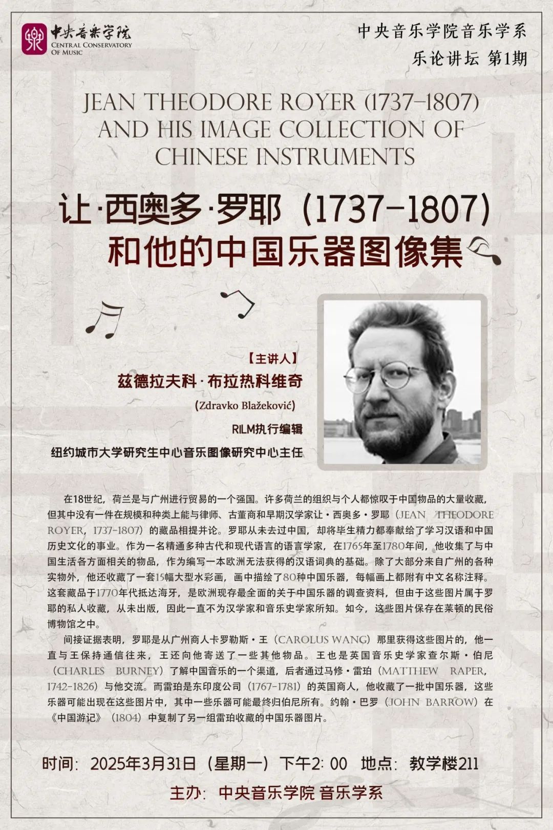 兹德拉夫科·布拉热科维奇(Zdravko Blažeković)是国际音乐文献资料全文数据库(RILM)的执行编辑,也是纽约城市大学研究生中心音乐图像研究中心的主任。1998年,他创办了音乐图像学期刊《艺术中的音乐》(Music in Art),并于2016年创办了《视觉文化中的音乐》(Music in Visual Cultures)专著系列(由Brepols出版社出版),并一直担任编辑。他的研究领域涉及18世纪和19世纪东南欧和中欧的音乐、音乐图像学、管风琴学、音乐史学、希腊和罗马管风琴学在现代的接受情况、19世纪初之前欧洲和中国之间的音乐交流以及中世纪和文艺复兴时期占星术中的音乐象征主义。