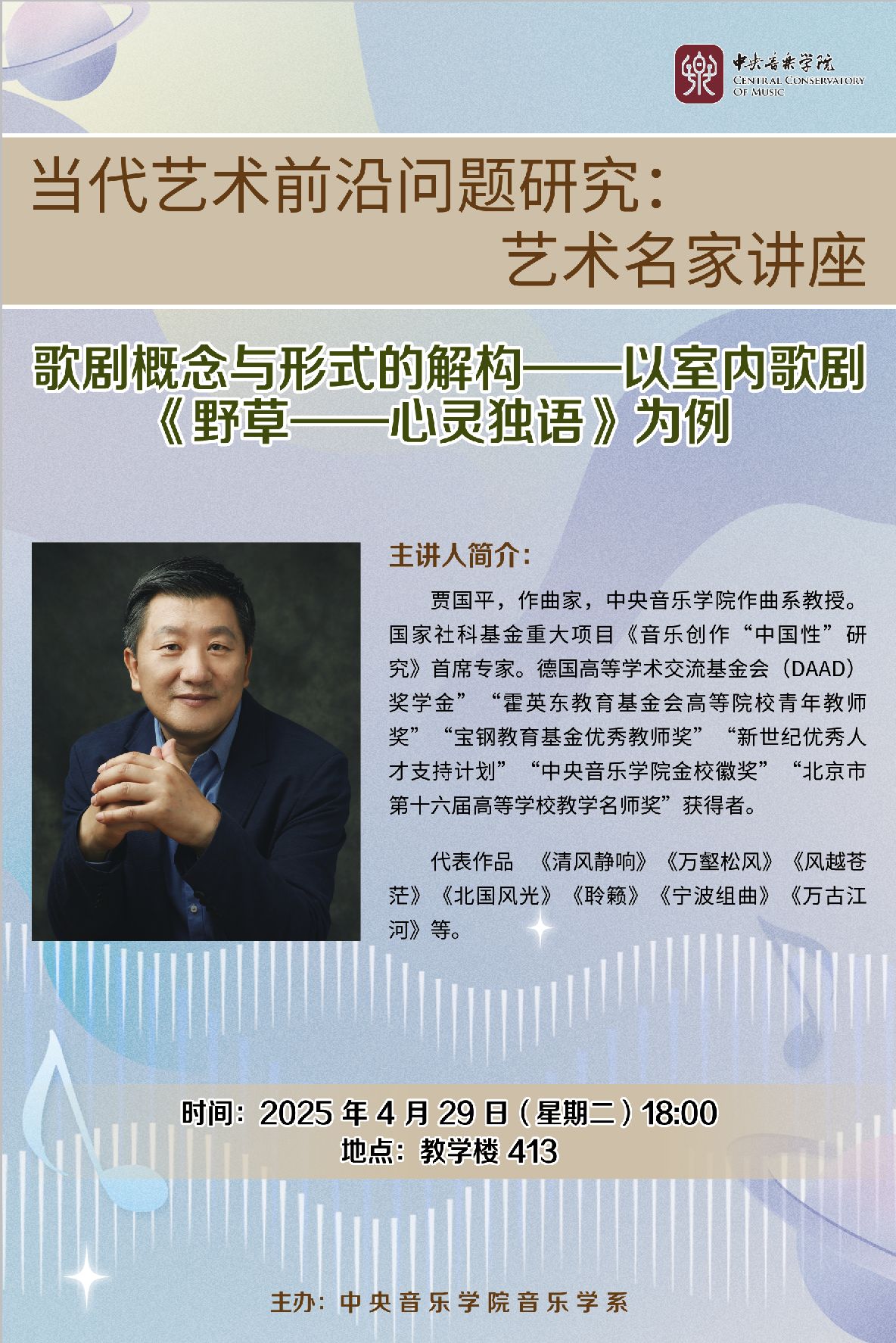 贾国平,作曲家,kaiyun体育网页登录入口作曲系教授。国家社科基金重大项目《音乐创作“中国性”研究》首席专家。德国高等学术交流基金会(DAAD)奖学金”“霍英东教育基金会高等院校青年教师奖”“宝钢教育基金优秀教师奖”,“新世纪优秀人才支持计划”“kaiyun体育网页登录入口金校徽奖”“北京市第十六届高等学校教学名师奖”获得者。