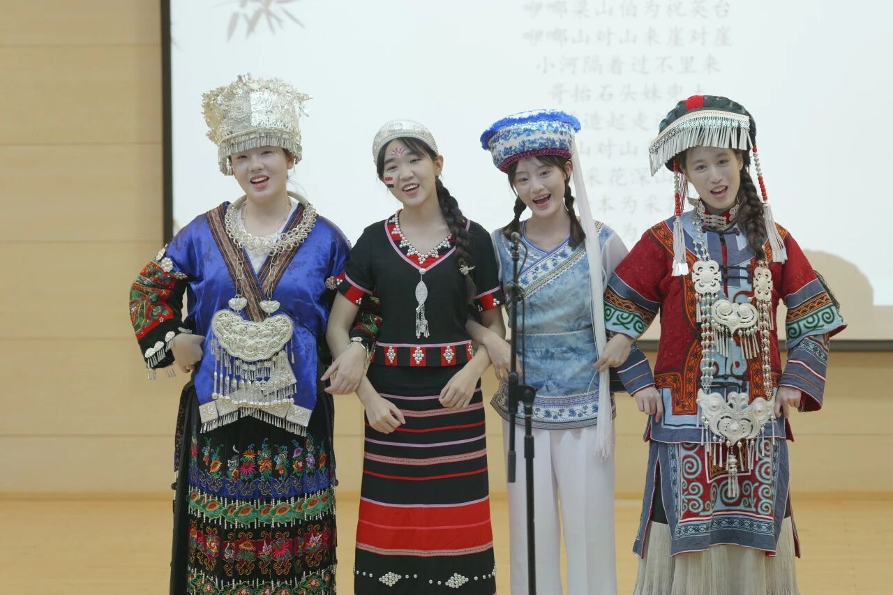 郑子欣、张典艺、张誉龄、李佳炫四位学生,身着各自精心准备、蕴含深厚民族文化的盛装惊艳登场。只见张誉龄身着从家乡贵州寄来的苗族华服,银饰摇曳生姿,未见其人,先闻环佩叮当之音,她以清澈嘹亮的嗓音独唱《苗岭飞歌》,将采风所得融入演唱,展现了这首经典苗歌的传承脉络。来自广西的张典艺身着彝族服饰,带来一首欢快活泼的《赶圩归来阿哩哩》。李佳炫身着佤族服饰,而郑子欣则以饰有“风花雪月”文化意象的白族华服亮相。最终,四人携手并肩,以充满感染力的齐舞形式共同唱响悠扬深情的《弥渡山歌》。这场融合了民族风采的视听盛宴,不仅是一幅瑰丽音乐画卷,更是学子们深入生活采风、珍视民族文化、进行生动表达的实践结晶。