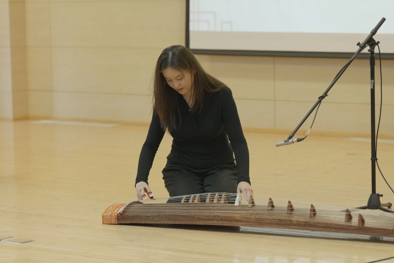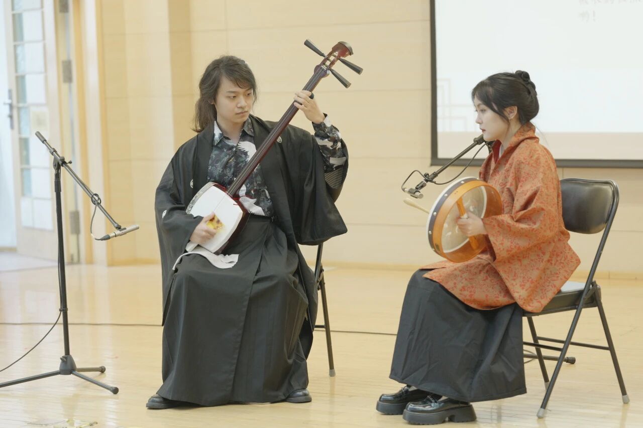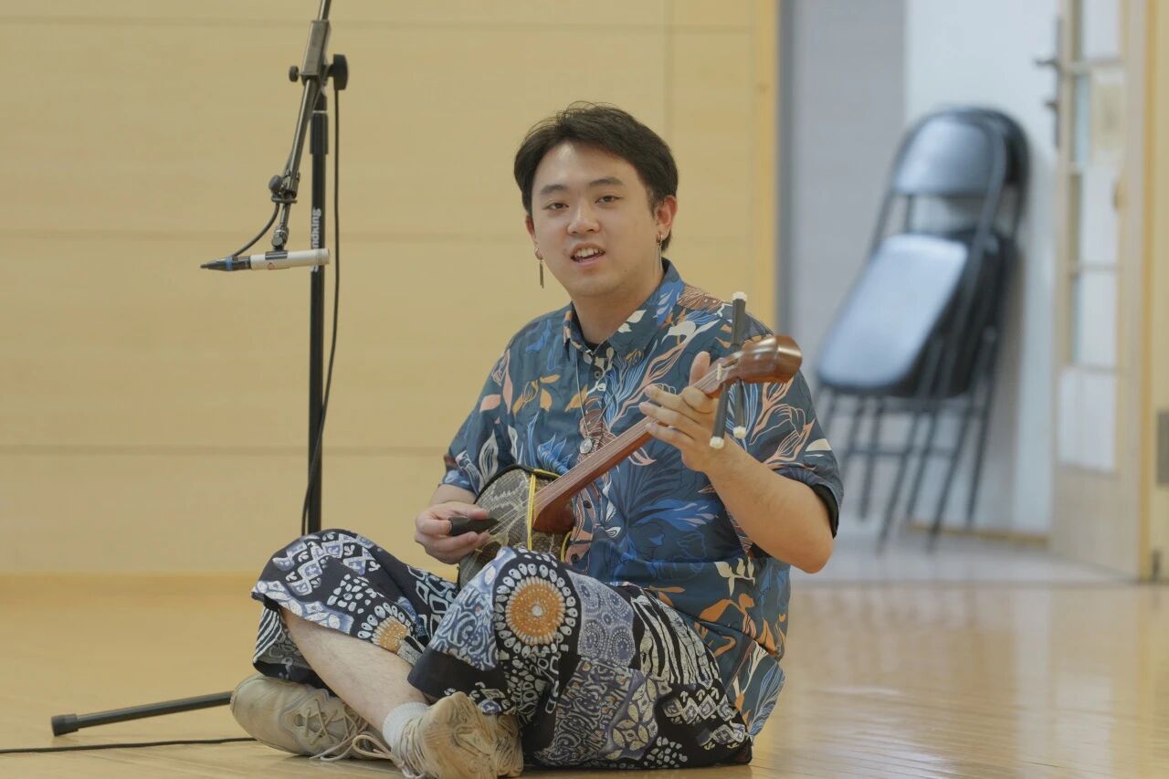 张浩哲怀抱三线,与张俪萱演奏的琉筝相和,共同演绎了结构类似分节歌式的冲绳新民谣《是啊,冲绳》(沖縄ジントヨー)。歌曲采用三线与琉筝的传统编制,歌词洋溢着对冲绳岛美丽风光的深情礼赞。表演者特别在演唱关键词“冲绳”(Okinawa)和“好地方”(yoi toko)时,热情邀请全场师生互动合唱,瞬间拉近了舞台与观众的距离。演奏过程中,三线琴弦意外松动,面对突发状况,张浩哲从容应对。这一充满“人情味”的即兴时刻,反而成为整场演出最真实、最动人的片段,淋漓尽致地展现了现场艺术的独特魅力与表演者临危不乱的专业素养。