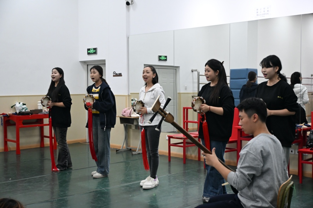 梅花大鼓又名梅花调,产生于清代中叶,最初由旗籍子弟玉瑞创建,主要流行于京、津两地。在我们不少人的印象里,梅花大鼓或许还停留在画质模糊的老影像里,总觉得与这门传统曲艺带着些“距离感”,但当我们走进教室,眼前的景象瞬间拉近了距离,一群初中生坐在教室中,面庞青涩稚嫩。只见他们熟练地拿出笔记本、简板与鼓楗子做好上课准备。年近古稀的授课教师籍薇,是梅花大鼓国家级非物质文化遗产代表性传承人,为了传承这门曲艺,她每周都从天津赶来为学生授课。