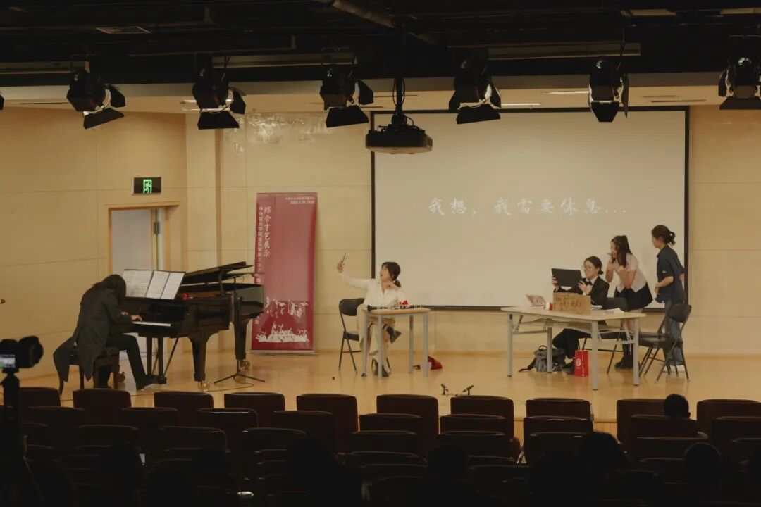 《音乐学系自救指北》则独出心裁地采用默剧的形式,仅利用字幕、伴奏与表演本身勾勒音乐学系学生的一天,带来复古又现代的视听体验。该节目由张弛、王睿、李欣睿、李姗珊、蒋伊涵、徐依婧、刘沫妃同学带来淋漓尽致的表演,同时穿插《培尔·金特》《“命运”交响曲》等等耳熟能详的音乐作品,让音乐学系学生妙趣横生又意外连连的校园日常在无声中跃然眼前,投映着在座每一位音乐学人生活中的笑与泪。