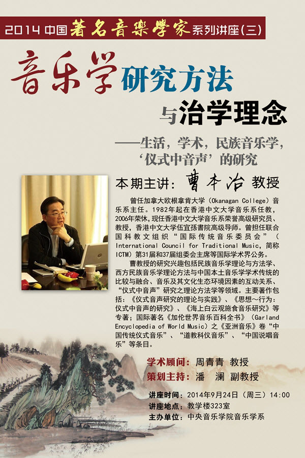 2014年9月24日,作为音乐学系系列讲座“音乐学研究方法与治学理念”课程的第3期,香港中文大学民族音乐学家曹本冶教授为同学们带来了一场精彩的讲座。他把将近两个小时的讲座分成两个部分,分别是“生活、学术、民族音乐学”与“仪式音声的研究”。