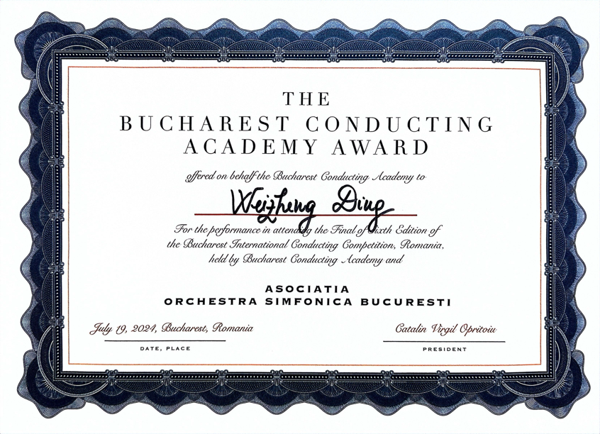 “第六届布加勒斯特国际指挥比赛”由布加勒斯特指挥学院联合布加勒斯特交响乐团举办,致力于为全世界优秀指挥提供合作平台以展现与乐团合作的能力。本次大赛对参赛选手没有年龄限制,以柴可夫斯基的管弦乐作品为主题。比赛共设三轮,包含对协奏曲、交响曲等多种体裁的考查。比赛评委会成员包括美国著名指挥家、瑞士国家交响乐团音乐总监、布加勒斯特交响乐团首席指挥John Axelrod;意大利著名指挥家、罗马尼亚蒂米什瓦拉国立歌剧院音乐总监David Crescenzi;布加勒斯特国立音乐学院教授、布加勒斯特交响乐团团长、长笛首席Catalin Opritoiu等。
