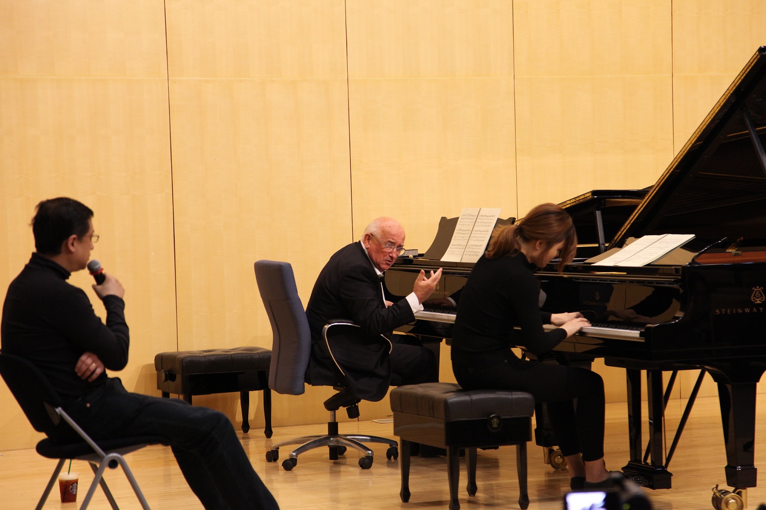 钢琴系的30余名学生代表接受了大师的指导,连续五天的课程如同一场浩瀚的贝多芬经典钢琴作品马拉松。钢琴系主科教师亲自翻译,清晰、充分地传达了大师的授课理念,让听者轻松地领会此次大师课的真谛。本次大师班堪称学术盛会,吸引了诸多业内专家和师生前来观摩,现场少长咸集、座无虚席。有的席地而坐,有的依墙而立,拥挤的现场丝毫没有影响听课者的兴趣,许多人带着乐谱来做笔记,更有一些乐迷拿着录像机前来记录下这些珍贵的瞬间。