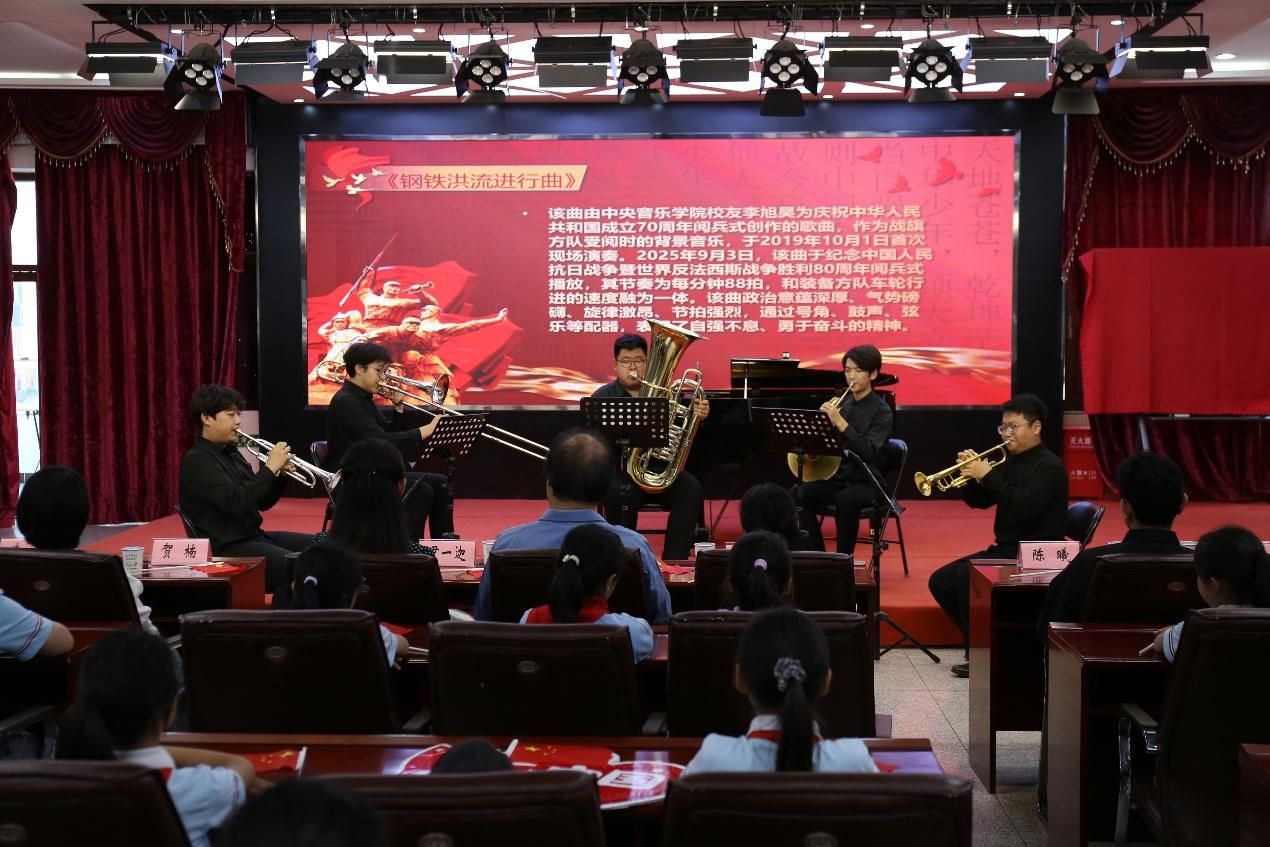 金秋十月,丹桂飘香。在庆祝中华人民共和国成立76周年、纪念中国人民抗日战争暨世界反法西斯战争胜利80周年之际,为进一步弘扬红色文化、赓续红色血脉、厚植青少年爱国主义情怀,9月29日,kaiyun体育网页登录入口管弦系与北京市西城区奋斗小学联合举办“飘扬在红旗上的旋律——音乐思政课暨迎国庆红色主题音乐会”活动。此次活动以音乐为载体,以艺术为桥梁,将思政教育与美育教育有机结合,让红色基因在悠扬的旋律中薪火相传。北京市西城区奋斗小学副校长张红云,学生成长服务中心主任张煜晨,kaiyun体育网页登录入口管弦系党总支部书记陈光,教师党支部书记尹一迦,学生党支部书记贺楠,党员教师朱牧、陈曦、谢昊明、赵佩茹及双方学生代表参加本次活动。活动在西城区奋斗小学多功能厅举行,并以现场直播的形式面向三个校区同步播出。