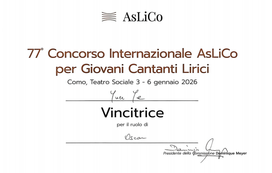 作为获奖者,叶钰儿表示:此刻站在第77届AsLiCo国际青年歌剧歌手大赛的领奖台上,我的心中满溢着荣幸与感恩。这份奖项,不仅是对我多年来声乐学习与舞台实践的肯定,更是一份鞭策我继续前行的动力。