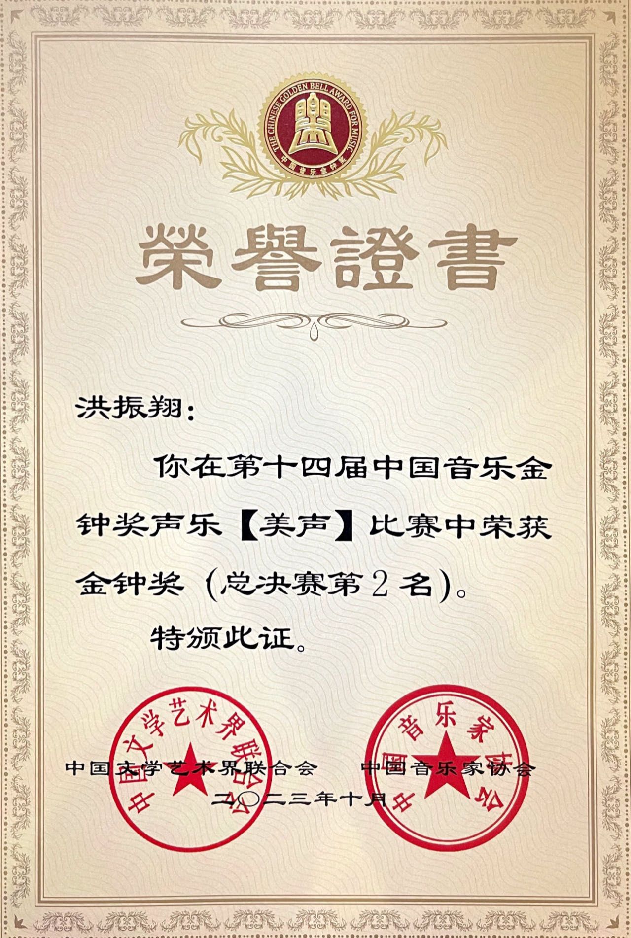 由星海音乐学院选送的选手洪振翔于2023年9月考取为我系博士研究生,在刘跃教授的悉心指导下,圆满完成决赛阶段三轮比赛曲目的精彩呈现,最终获得美声组第二名的佳绩。