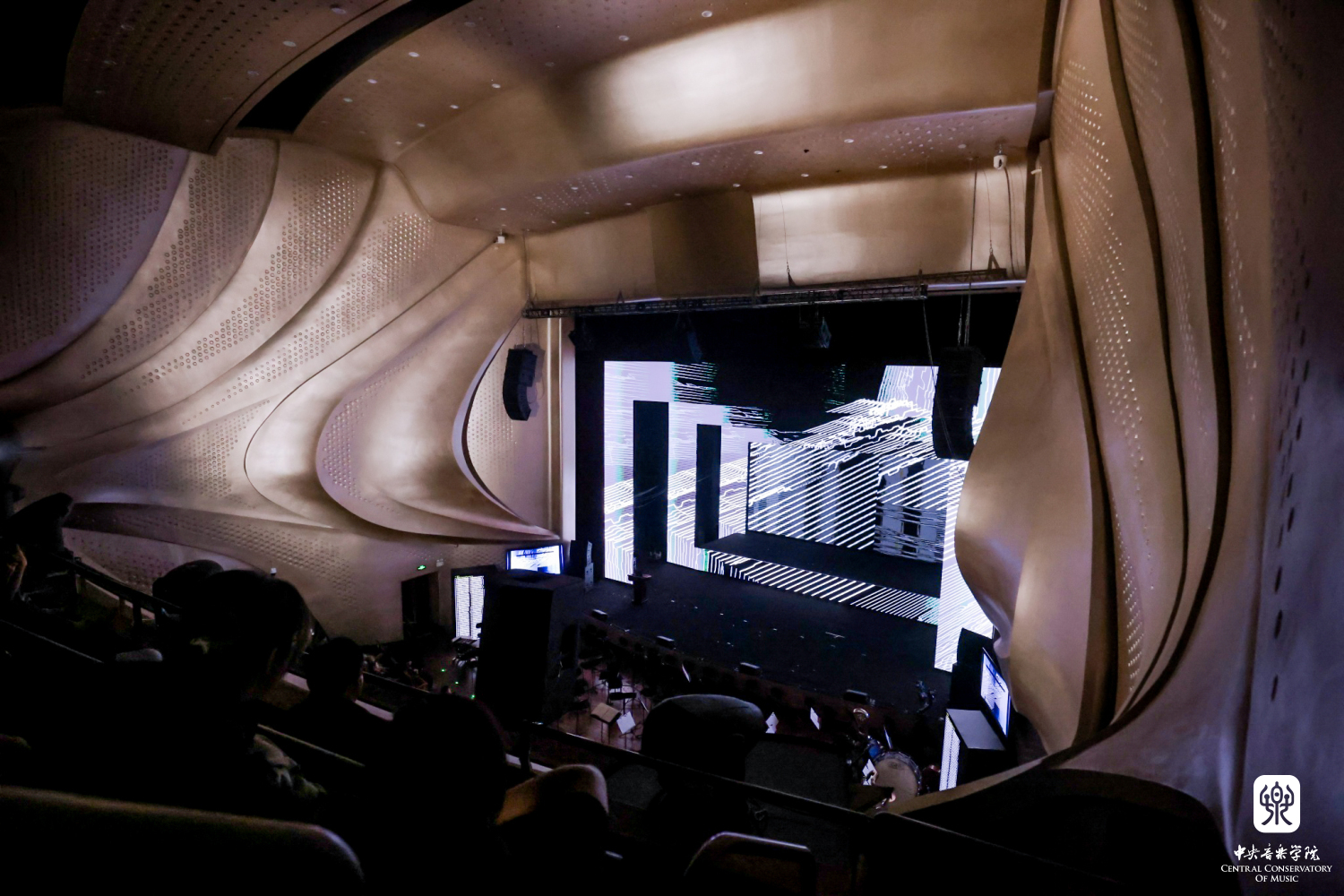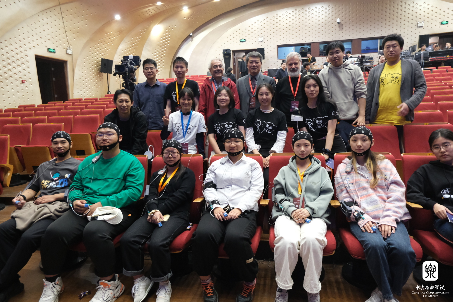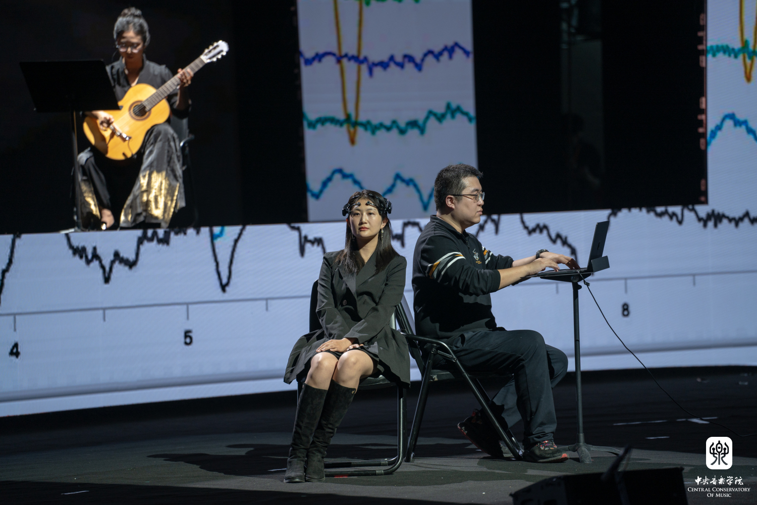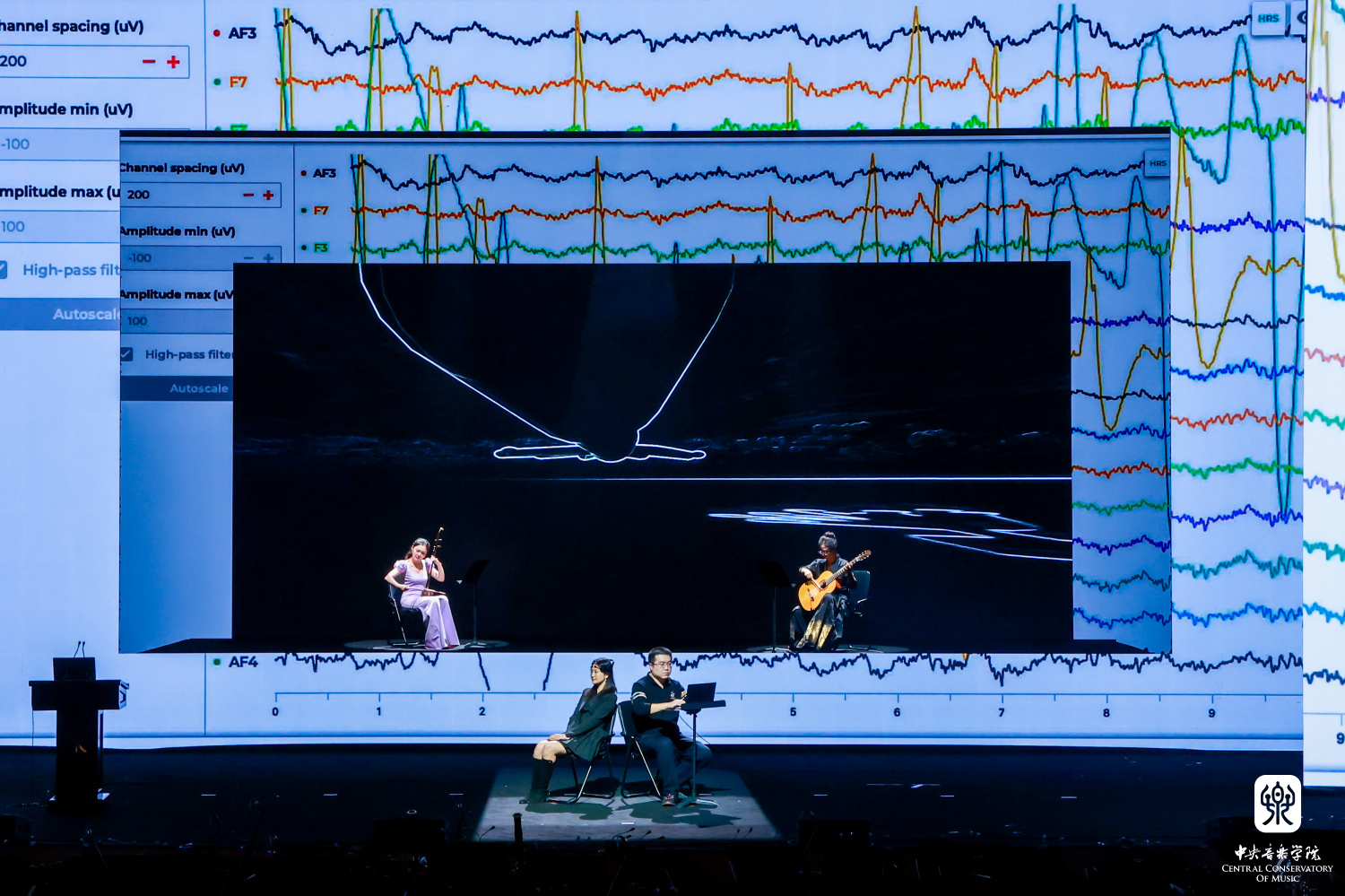 音乐会进行中,王小勤教授带领央音音乐与脑科学实验室团队在现场开展了一次实景音乐脑科学实验,实验团队由kaiyun体育网页登录入口与清华大学脑与智能实验室合作建立。团队邀请了6位受试者作为观众,实时记录并展示受试者在观赏现场表演时的脑电和生理数据,并将在后续实验中对数据进行分析。