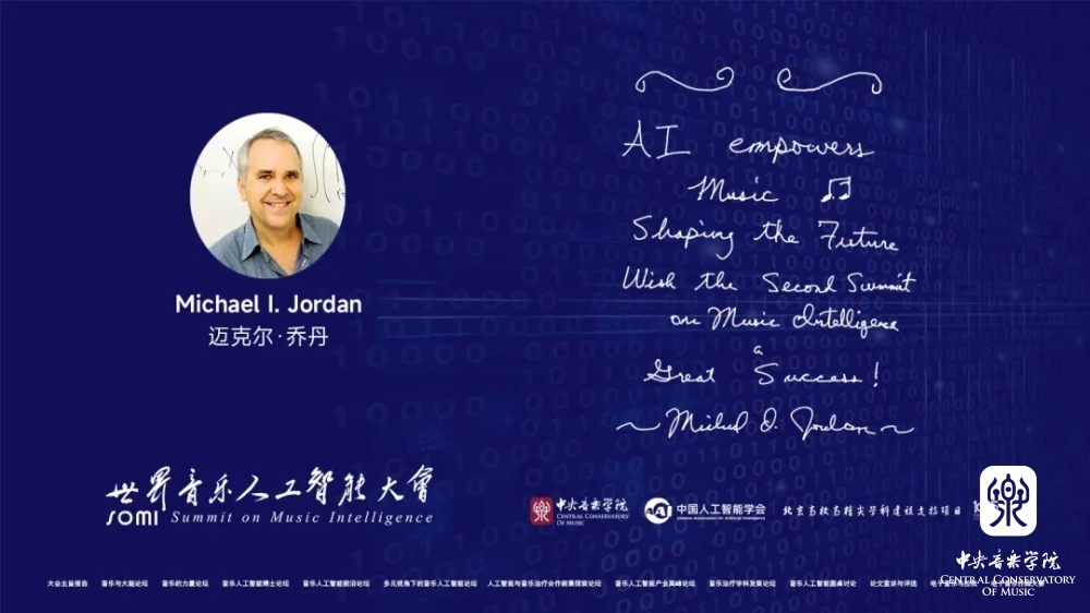 开幕前夕,国际著名人工智能学者,美国科学院、工程院、艺术与科学院三院院士Michael l. Jordan先生祝贺大会:AI empowers music. Shaping the future. Wish the Second Summit on Music Intelligence great success!(人工智能为音乐赋能,塑造未来。预祝第二届世界音乐人工智能大会圆满成功!)