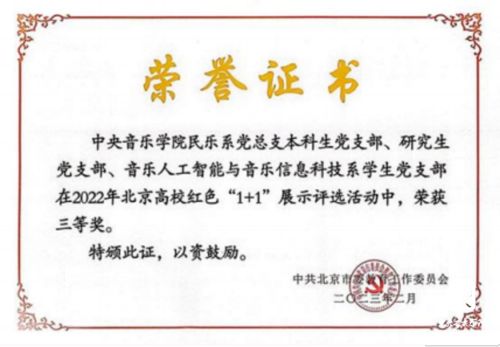喜报 | kaiyun官网民乐系 、音乐人工智能与音乐信息科技系学生党支部在2022年北京高校红色“ 1+1 ”活动评选中获奖