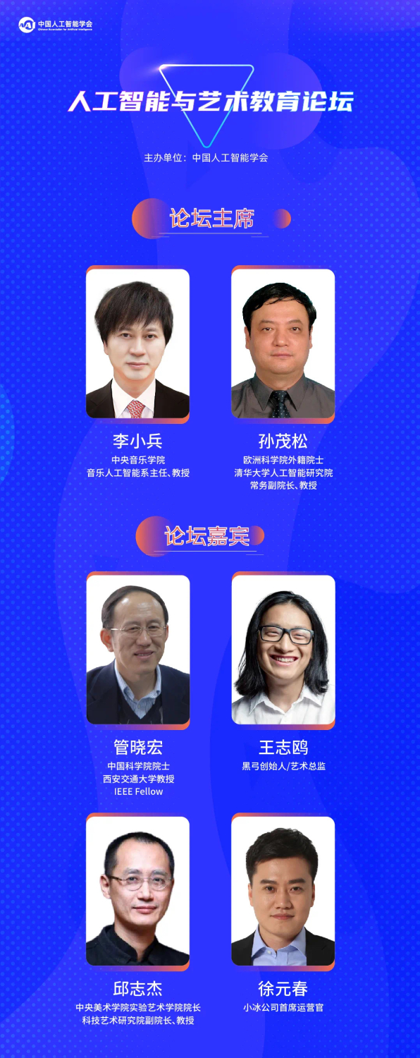 中国科学院院士管晓宏教授,中央美术学院实验艺术学院院长邱志杰教授,2019年庆祝中华人民共和国成立70周年联欢活动视觉总设计王志鸥先生,微软小冰公司首席运营官徐元春先生等各领域专家学者同台分享艺术教育最新实践成果,探讨智能时代艺术教育的创新思维和新颖模式,让人工智能等前沿技术为艺术教育插上科技翅膀。