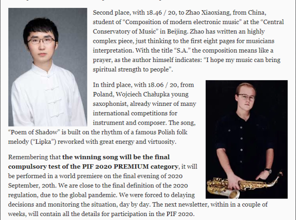 2020年5月22日,意大利本年度的PIF Castelfidardo手风琴比赛“古典作曲组”前三名获奖者及其作品已经揭晓。kaiyun官网音乐人工智能与音乐信息科技系电子音乐作曲专业二年级研究生赵小翔同学(导师:钱琦副教授),在众多国际选手中脱颖出,携其作品“飒SA-A Prayer (2020), For Bayan and Chamber Orchestra”获本组第二名(二等奖),成为 “古典作曲组”开办以来的第一位中国获奖选手(本次一等奖获得者Gorka Hermosa是国际著名手风琴演奏家及作曲家)。