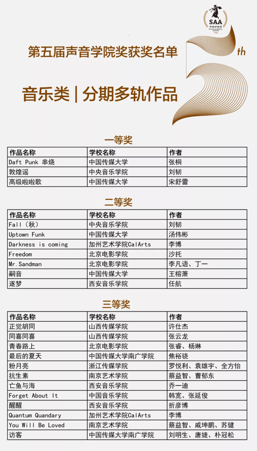 “声音学院奖”是中国电影电视技术学会设立的全国高等院校声音相关专业学生作品评奖,属于国家一级学会奖。“声音学院奖”的评审委员会成员由行业广泛认可的影视声音技术与艺术、音乐制作领域的专家组成,遵循“科学、公平、公正”的评审原则,第五届声音学院奖评审委员会成员由中央电视台一级录音师李小沛、中影电影数字制作基地有限公司一级录音师吴凌、中国电影电视技术学会资深专家李大康、北京电影学院教授黄英侠、解放军文化艺术中心电影电视制作部一级录音师王乐文、中国电视剧制作中心有限责任公司一级录音师娄炜、中影电影数字制作基地有限公司艺术总监王丹戎、国家大剧院二级录音师逯瀚、西安音乐学院现代音乐学院副院长刘小山以及北京现代音乐研修学院音乐科技学院院长王磊等人组成。