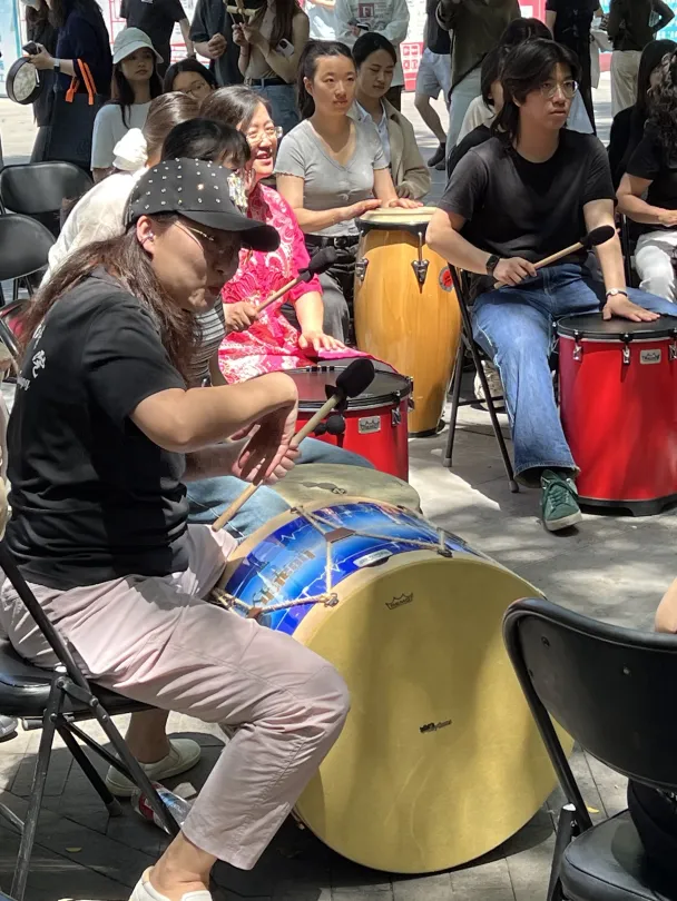 有力的击打伴随着畅快的呼气声,仿佛将堆积的压力瞬间释放;轻柔的沙沙声和清脆的铃声响起时,大家的脸上不由自主地浮现出宁静的微笑。从一开始机械地跟着鼓点,到后来完全沉浸在声音里,好像所有的情绪,无论是焦虑还是兴奋,都找到了出口,并随着鼓点流淌出来。