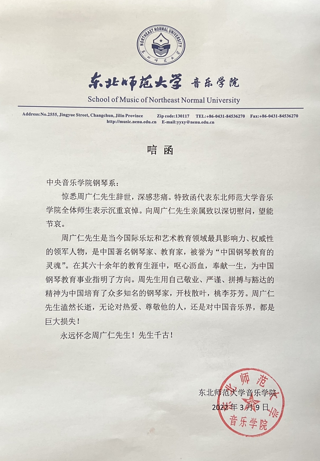东北师范大学音乐学院致唁电 悼念周广仁先生