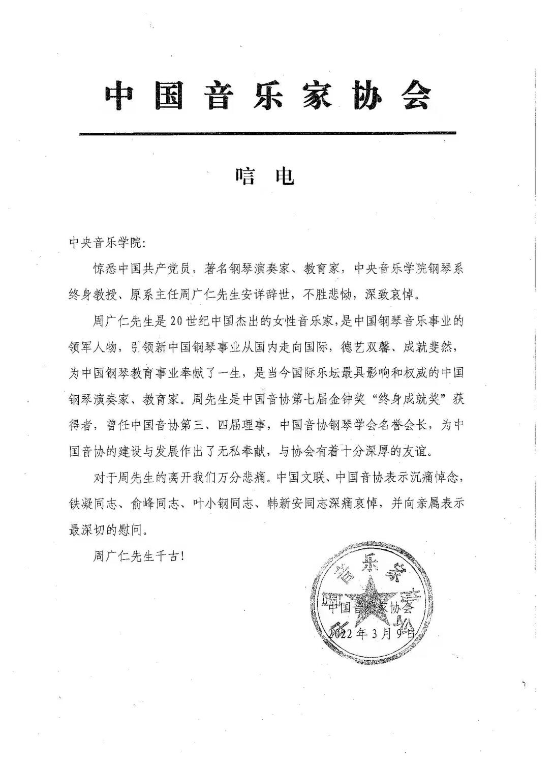 中国音乐家协会致唁电 悼念周广仁先生