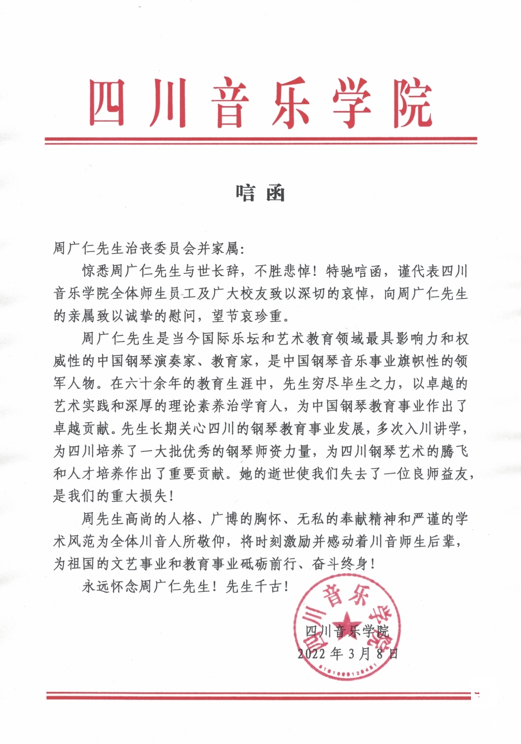 四川音乐学院致唁函 悼念周广仁先生