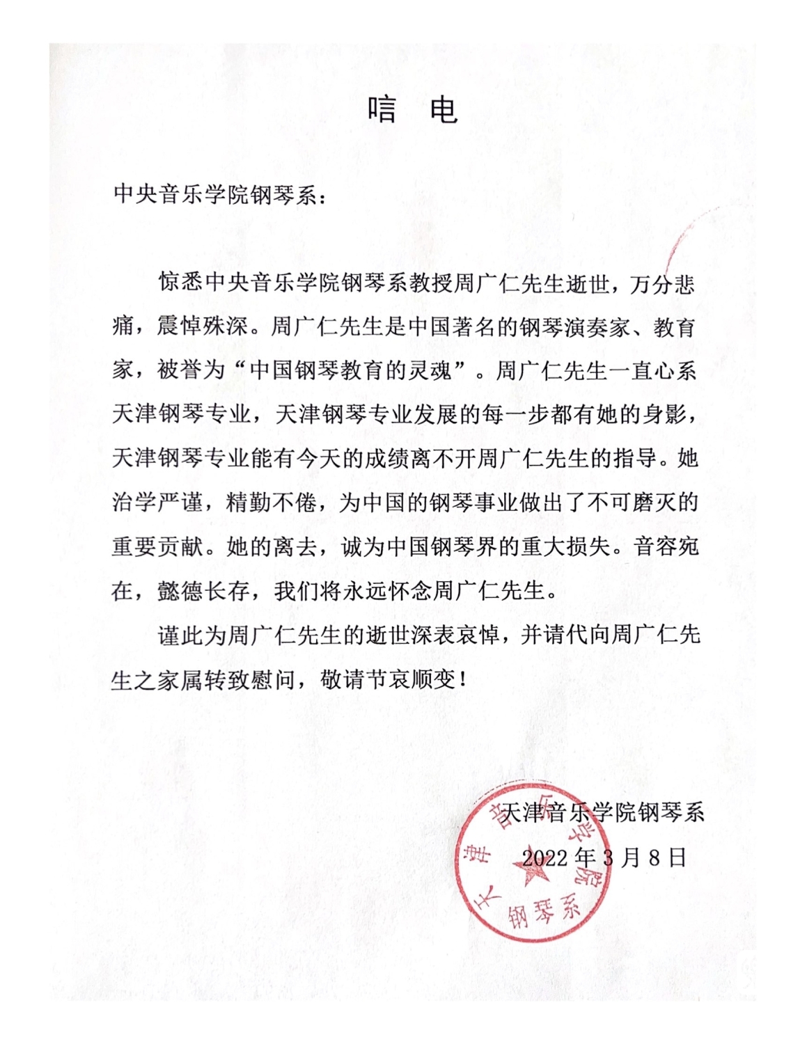 天津音乐学院钢琴系致唁电 悼念周广仁先生