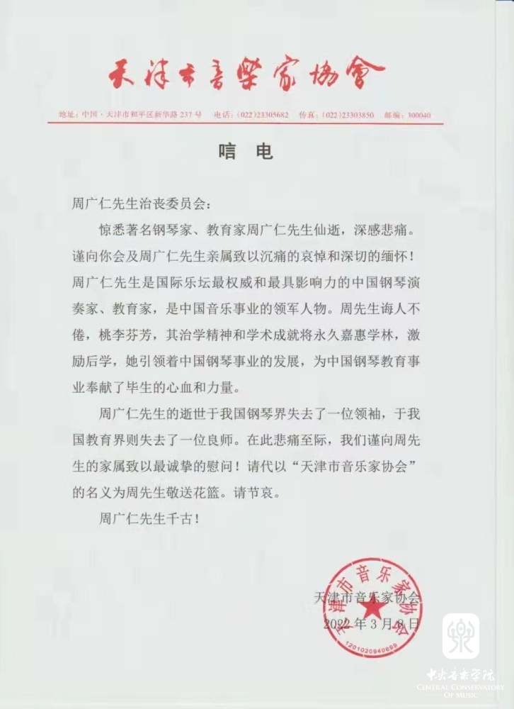 天津市音乐家协会致唁电 悼念周广仁先生