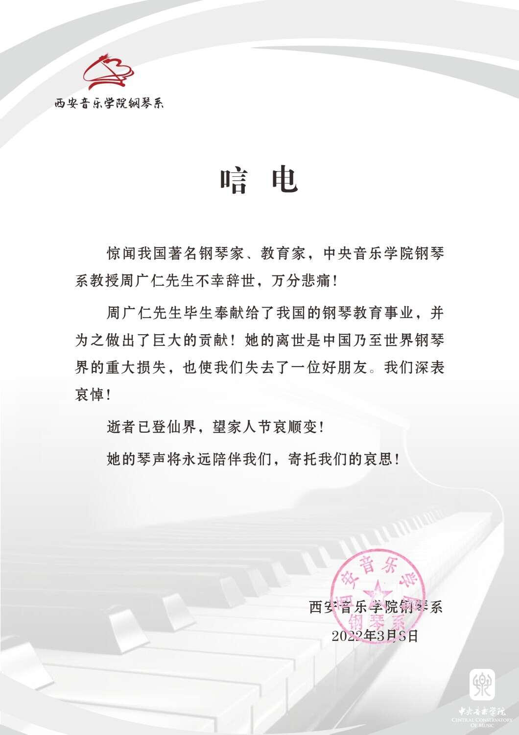 西安音乐学院钢琴系致唁电 悼念周广仁先生