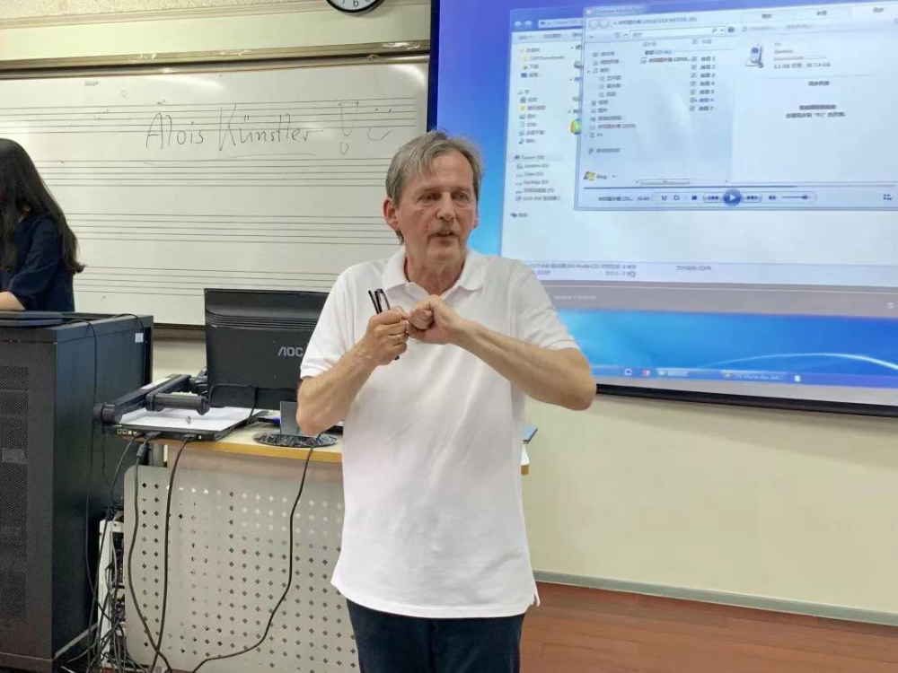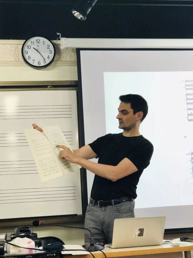 纪尧姆 · 勃艮第教授是法国Court—circuit乐团的指挥,他从指挥家的视角切入音乐排演实践中,审视了作曲家在创作时的应具有的审美思考维度。讲座中他提到了作曲家的“手稿”(manuscript)记录方式,一语中的的说,演奏家对手稿直观地记谱感受与作曲家想要呈现的最终音响效果,往往截然不同。这充分说明,每个人在感受音乐语言的同时情不自禁会带入自我的审美理解。纪尧姆教授称赞了利盖蒂(Ligeti György Sándor,1923年5月28日-2006年6月12日,当代古典音乐先锋派作曲家,匈牙利人)在乐谱中使用脚注标明音乐意图的方式,他认为这样更加有助于外界可以直接通过乐谱与作曲家进行沟通。纪尧姆教授在讲座中强调了沟通的重要性!作为指挥家的他认为,指挥家、演奏家、作曲家之间都需要进行更加明确的沟通,甚至有必要做的事是和听众进行充分沟通。这样做便于把握作品的整体审美倾向,和内在意义的理解与诠释。