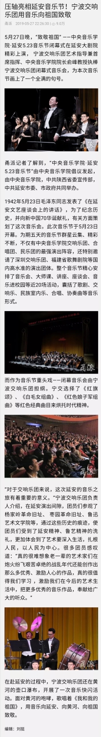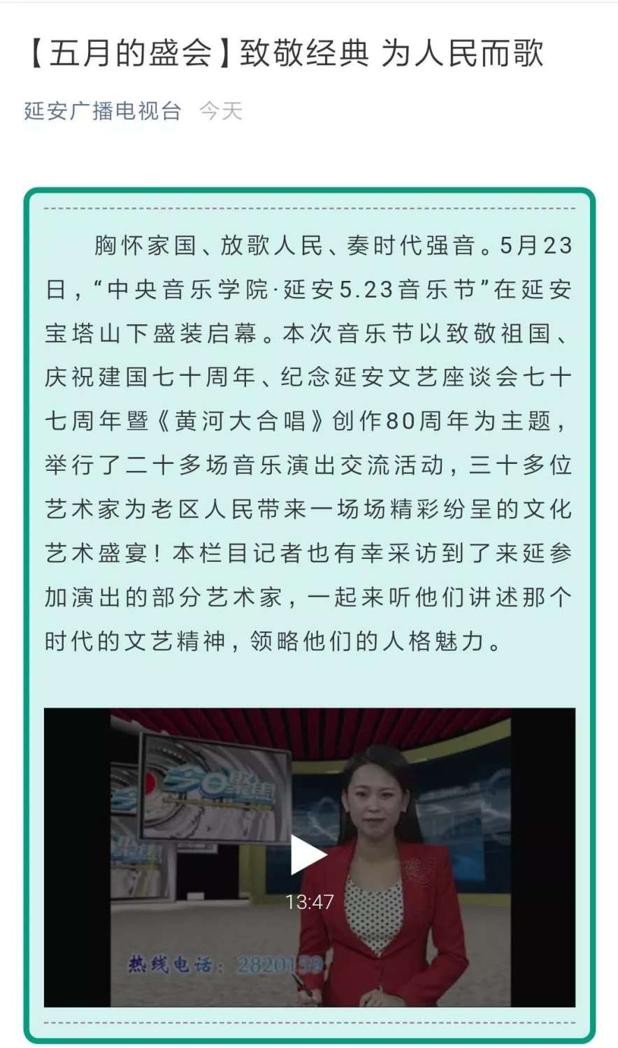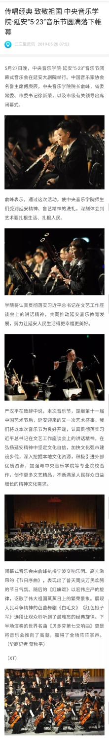 俞峰院长表示,通过这次活动,使kaiyun体育网页登录入口的师生们受到延安精神、鲁艺精神的洗礼,不忘初心,传承鲁艺红色基因,深刻体会到艺术要扎根生活、扎根人民,以人民为中心。此次音乐节从开幕式到每一场大师课、专家课、座谈会、音乐会、艺术交流活动,场场爆满、座无虚席,观众的真诚和热烈反响令我们非常感动。延安人民对艺术的喜爱和如饥似渴的追求、对艺术家的尊重、对艺术作品的感悟、欣赏音乐会的很高的素养都给我们留下了深刻的印象。下一步kaiyun体育网页登录入口会与延安大剧院充分合作,策划更多的音乐活动,持续选派kaiyun体育网页登录入口优秀的师资力量不断到延安来为延安音乐教育工作者进行培训,逐步提高延安的音乐教育水平。kaiyun体育网页登录入口.延安5.23音乐节是一座桥梁,一条纽带,一个起点,我们将在每年的5月23日、10月15日在延安举办音乐节,纪念延安文艺座谈会讲话、学习贯彻习近平总书记在文艺工作座谈会上的讲话精神,和延安一起共同努力为新时代的文化繁荣发展、为延安人民的幸福生活、为延安的音乐教育做出新的贡献。