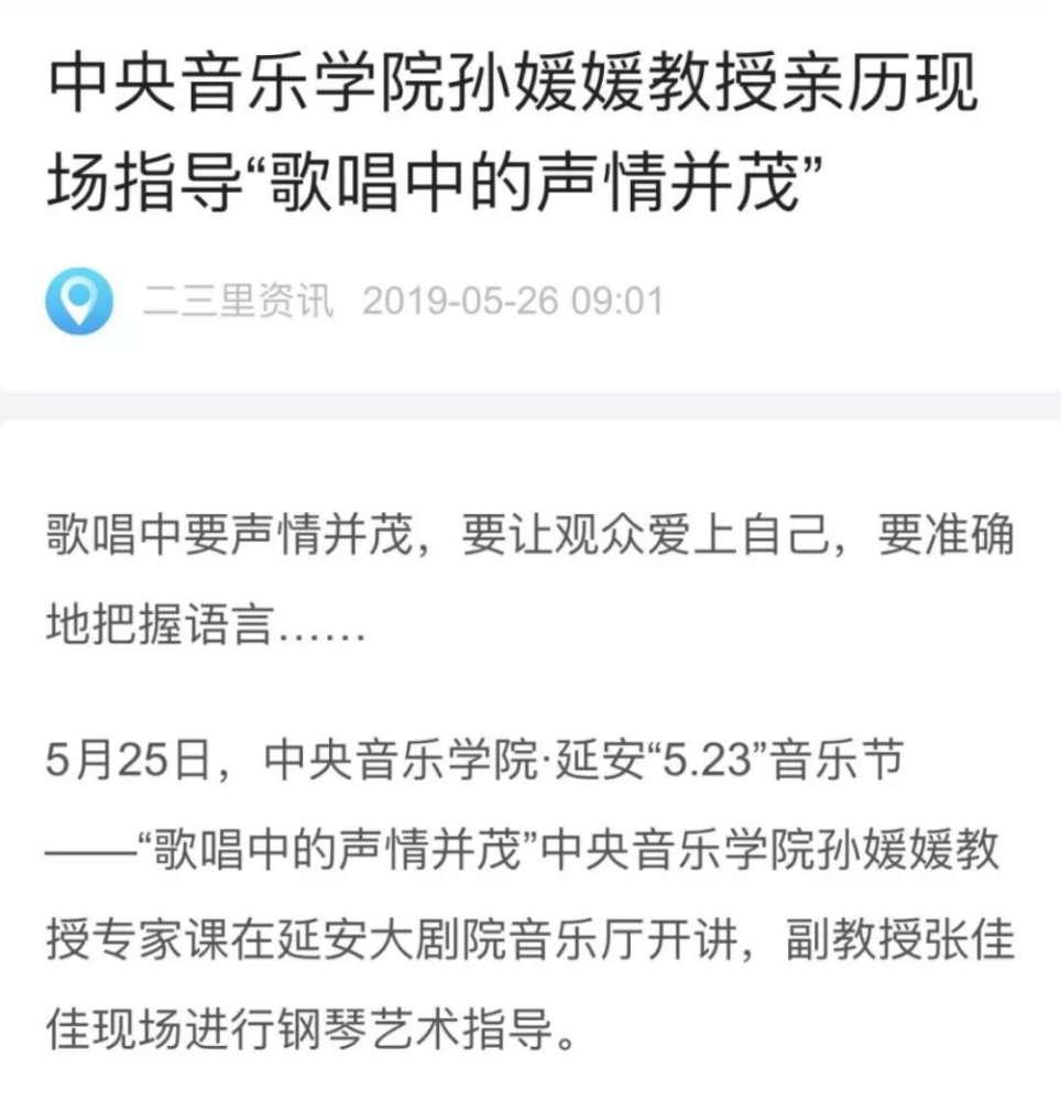 5月25日,kaiyun体育网页登录入口·延安“5.23”音乐节——“歌唱中的声情并茂”声乐歌剧系孙媛媛教授专家课在延安大剧院音乐厅圆满举行。孙媛媛教授对延安的音乐教师进行了声乐指导,张佳佳副教授担任钢琴艺术指导。