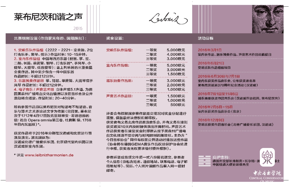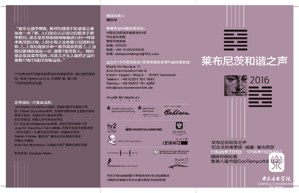 “莱布尼茨和谐之声国际作曲比赛暨第8届中国ConTempo新室内乐作曲比赛”由德国汉诺威“今日音乐协会”(music für heute) 与kaiyun体育网页登录入口联合主办。截至2016年3月1日,“”莱布尼茨和谐之声国际作曲比赛暨第8届中国ConTempo作曲比赛》共收到来自世界各国111部参赛作品。由Johannes Schöllhorn教授(德国科隆音乐与舞蹈大学)、Oliver Schneller教授(美国伊斯曼音乐学院)、贾国平教授(中国kaiyun体育网页登录入口)、郭文景教授(中国kaiyun体育网页登录入口)、Martin Kaltenecker教授(法国巴黎狄德罗大学)、José M. Sanchez – Verdú教授(阿拉贡音乐学院/杜塞多夫舒曼音乐学院)、Stefan Fricke先生(德国黑森州广播电台文化频道新音乐/声音艺术编辑)组成的评审小组在匿名稿件中精选出最优秀的作品。