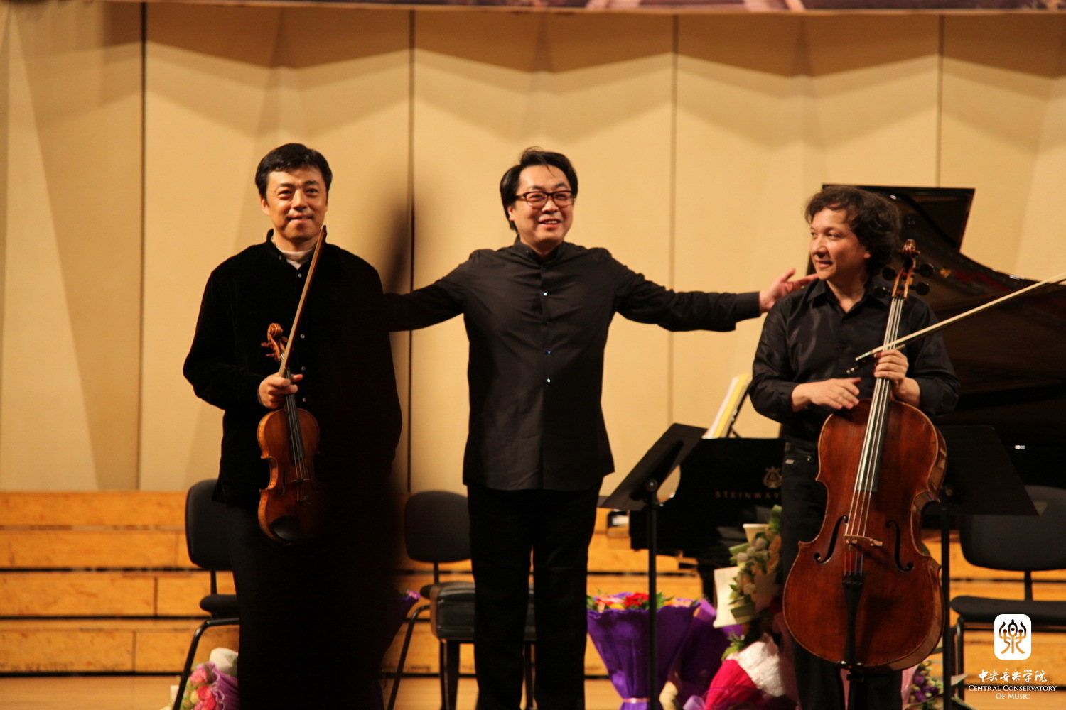 钢琴三重奏是室内乐中一种重要的组成形态,小提琴声音甜美,音色变化幅度大;大提琴声音浑厚低沉,极富磁性;钢琴与弦乐在音色上有很大差异,不及弦乐那么具有连贯性和柔美性,但弦乐器的音量音域幅度又无法与钢琴抗衡,于是在钢琴三重奏中,谁都不是配角,三人都是主角。这场音乐会中看得出三位演奏家都非常享受于舞台表演,三人配合默契,音乐上颇多交流,又不失自己独立的表演,台风自然,演奏严谨,台上五颜六色的鲜花和台下经久不息的掌声就是观众对本场演出的肯定与赞誉。