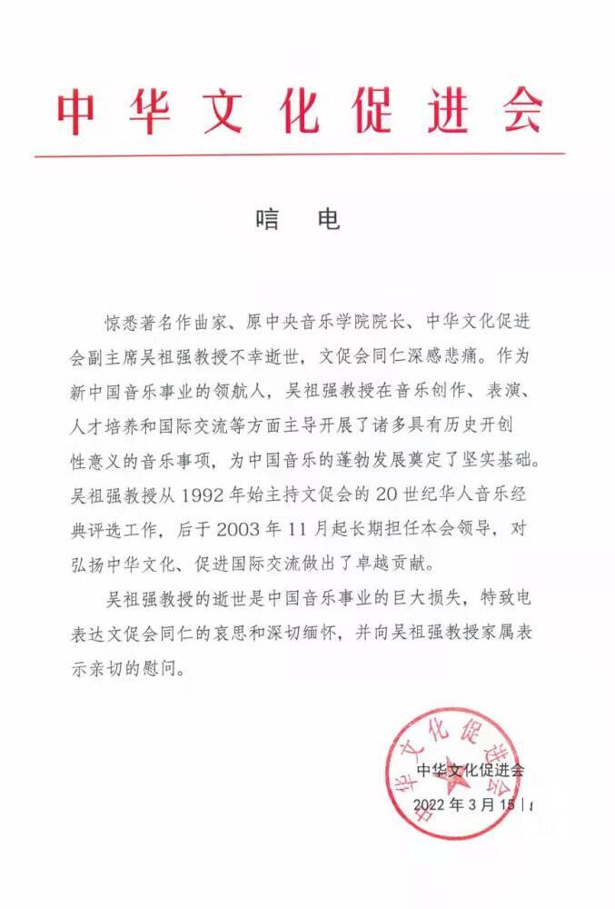 中华文化促进会致唁电 悼念吴祖强教授