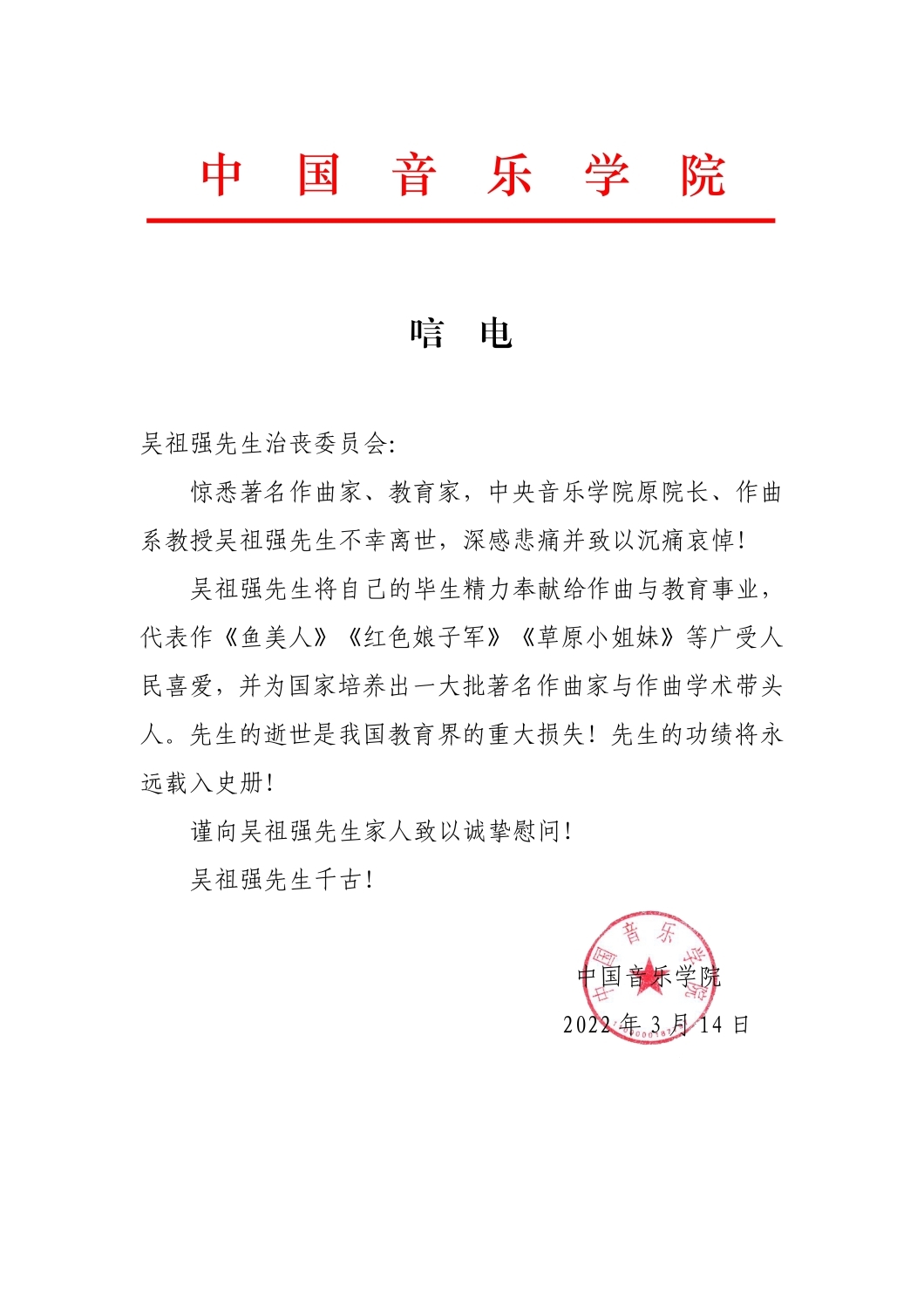 中国音乐学院致唁电 悼念吴祖强教授