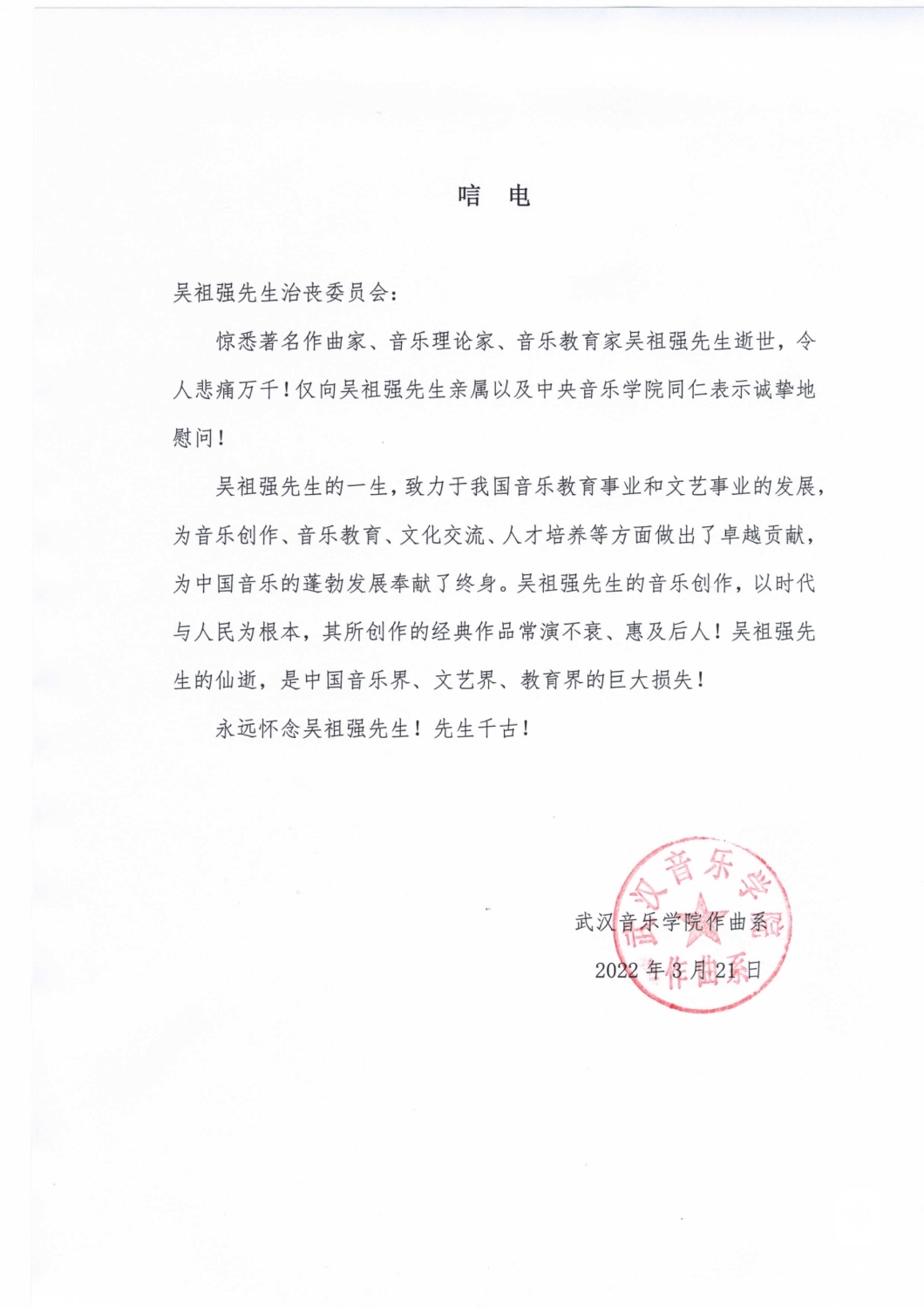 武汉音乐学院作曲系致唁电 悼念吴祖强教授