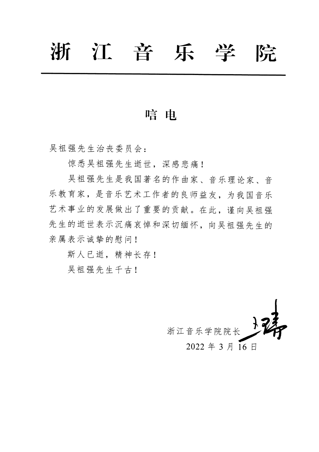 浙江音乐学院院长王瑞致唁电 悼念吴祖强教授