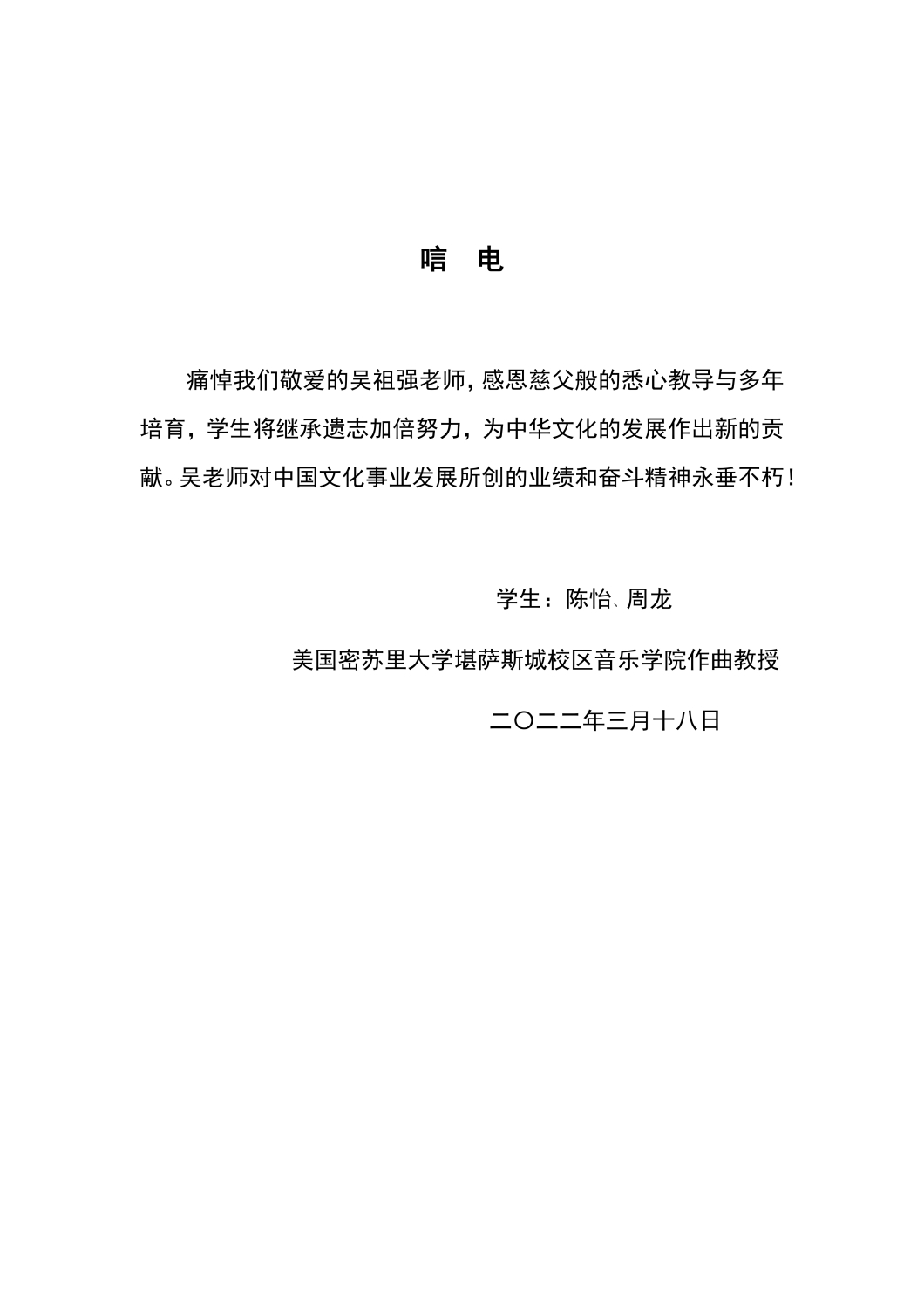 学生陈怡、周龙致唁电 悼念老师吴祖强教授