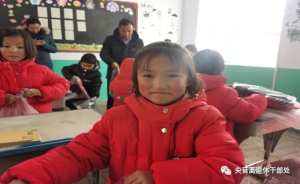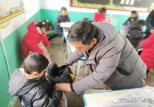 快递接收点离学校很远,挂职红牙合村第一书记李玮多次往返搬运这批捐赠物资,上图为李书记正在帮助学前班的学生穿羽绒服。