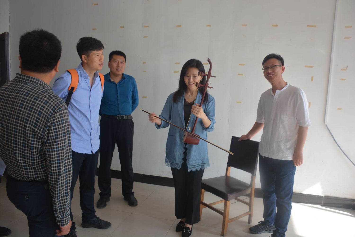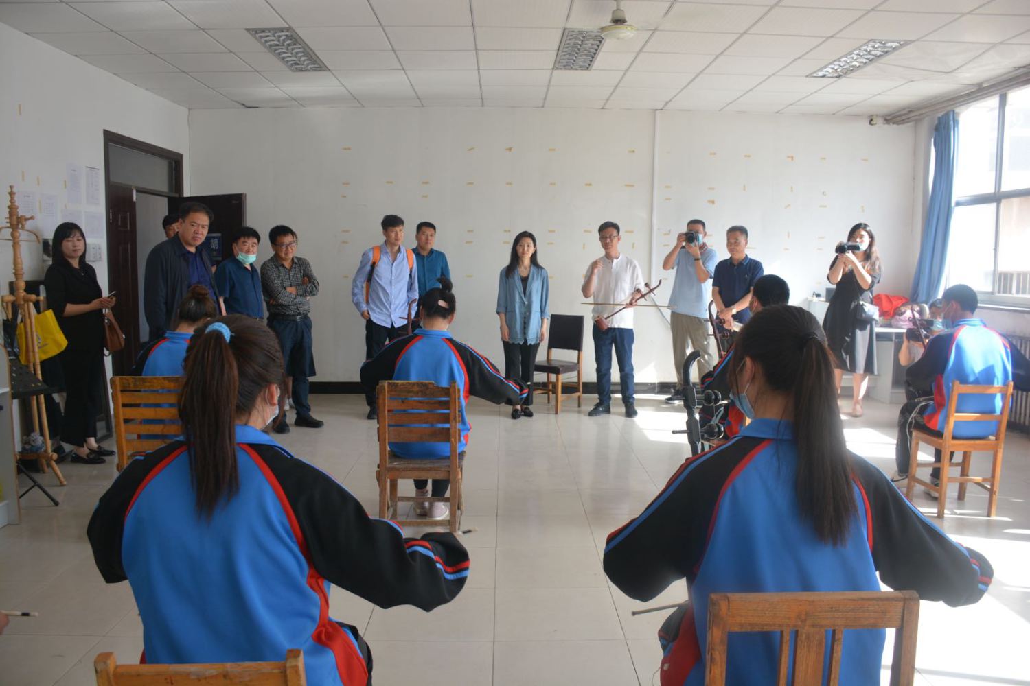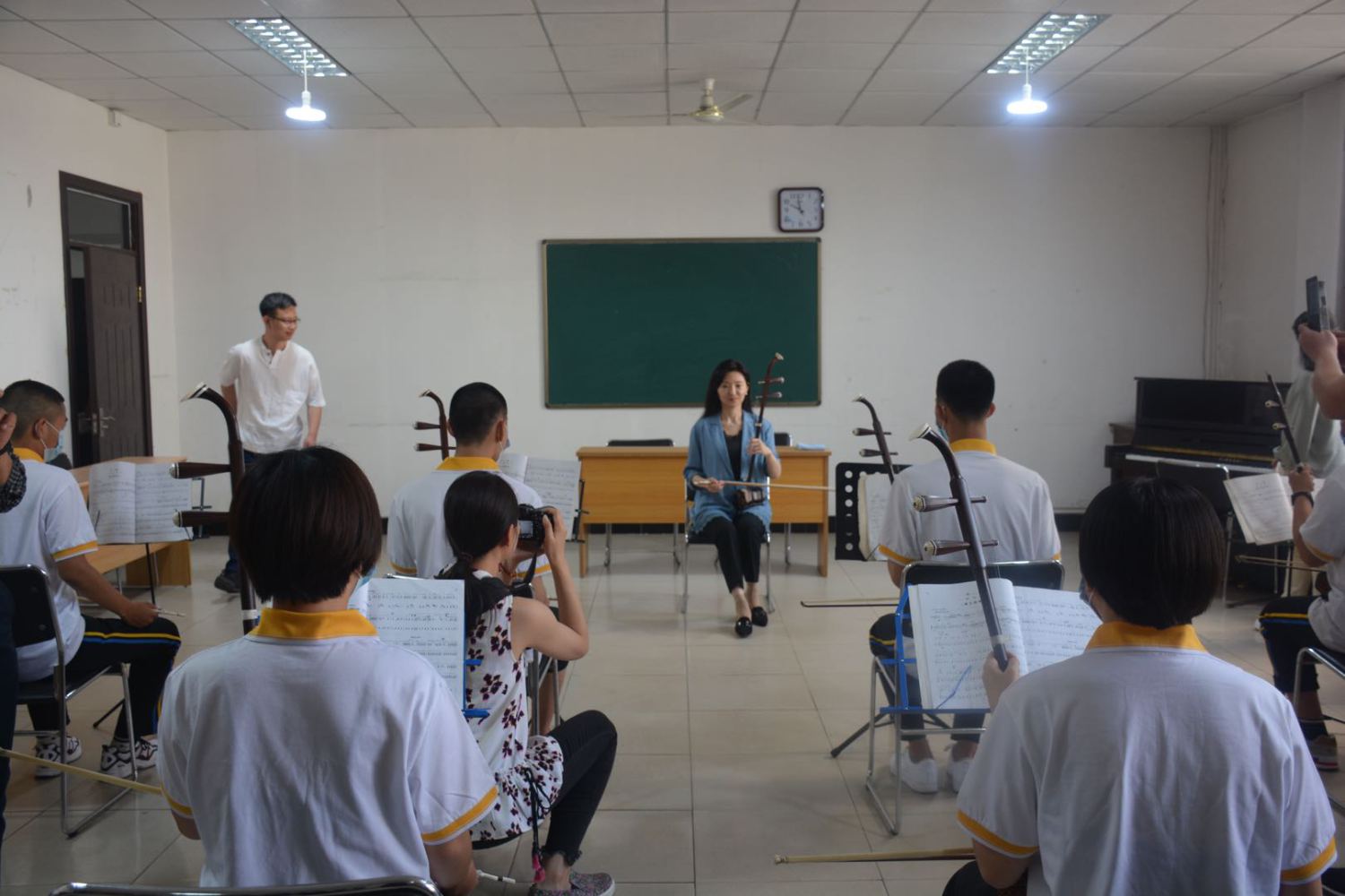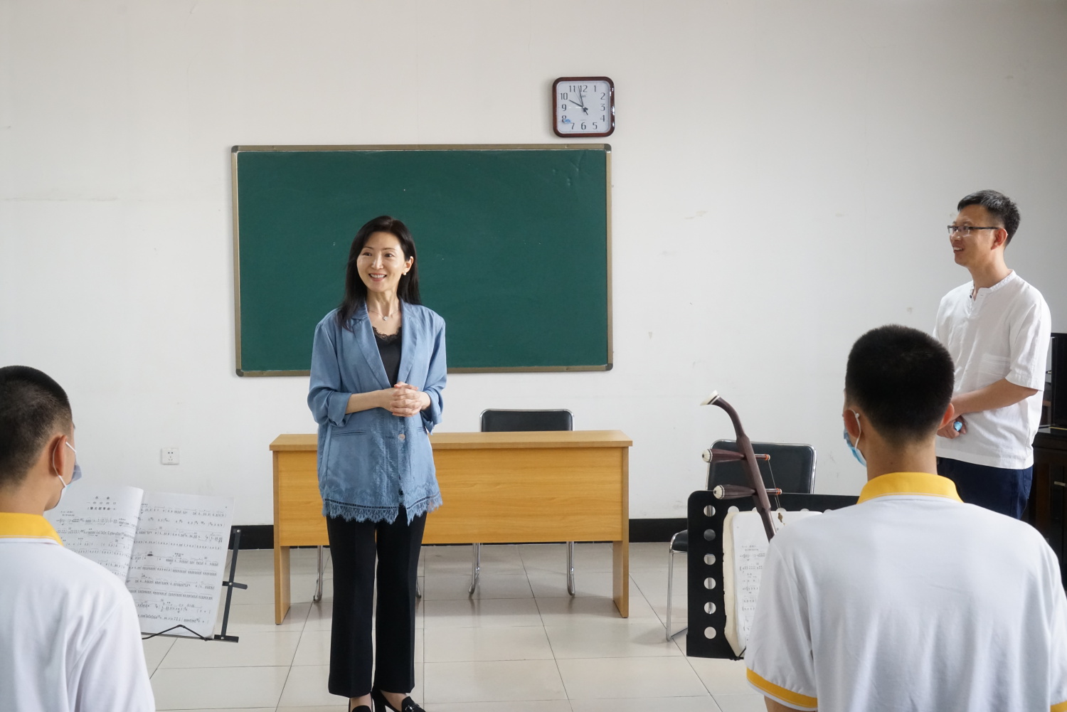 2020年6月2日下午,为了解当地音乐教育现状及师生的切实需求,于红梅副院长一行来到青龙满族自治县第二中学(以下简称青龙二中)展开调研,首先观看了青龙二中精心安排的专业教学成果展示,并由kaiyun官网各专业教师分别走访不同专业教室,与学生们在专业上进行了深入交流,并对提出的问题进行了细致解答与悉心指导。当于红梅副院长走进二胡专业教室时,受到了在场师生的热烈欢迎。同学们亲眼见到一直以来的“偶像”老师,按捺不住激动的心情纷纷举手请于红梅副院长为大家现场演奏一曲。于红梅副院长欣然答应,接过一位同学手上的二胡,倾情演奏了他们正在学习的《豫北叙事曲》,令在场师生拍手叫绝,掌声与赞叹经久不息。