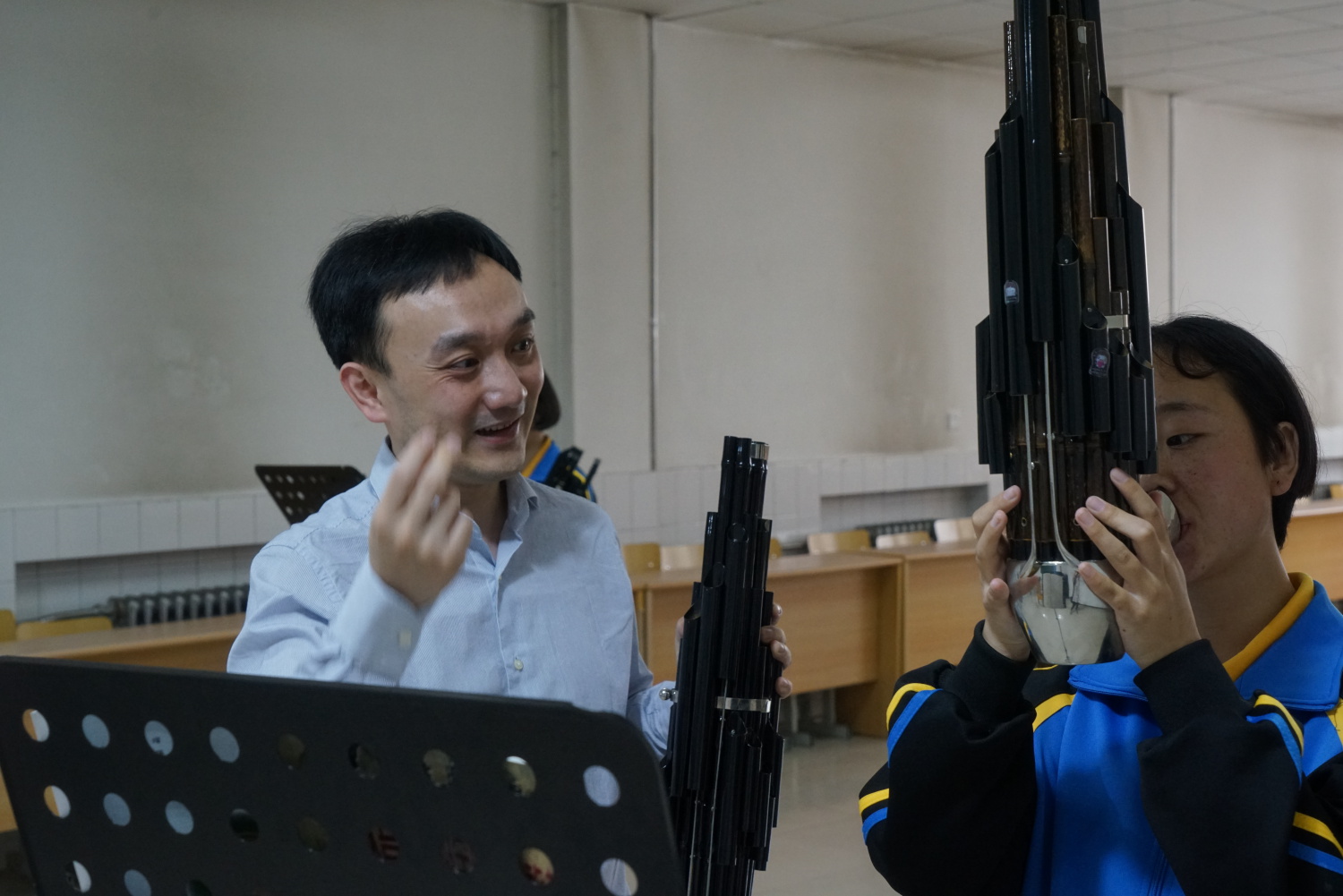随后,kaiyun官网教师王磊、谢天、胡瑜、刘音璇、冯天石根据帮扶调研工作要求以及会前对各专业教学水平的基本掌握情况,从各自专业角度出发,围绕帮助青龙二中提升教学整体水平,提出了许多切实可行的建议:王磊老师表示优秀传统文化应更好地融入到人才培养全过程,教学可选用具有家国情怀、把握时代脉搏的音乐作品。谢天老师谈到音乐传承最重要的基础教育,青龙二中的教学条件及学生专业素质,都具有较好的基础,非常愿意帮助青龙从声乐专业上实现突破。胡瑜老师围绕加强交流提出了多种途径的建议,并谈到民族室内乐课程将使青龙的民乐教学体系更加完善,并带来新的契机。刘音璇老师表示通过与扬琴专业师生们的短暂交流,感受到青龙县政府对艺术教育事业的重视及二中老师们的良苦用心,这对高等音乐院校的教师也是一种激励。冯天石老师从年轻教师的角度谈到此行是非常宝贵的教学与学习经验,希望今后能继续帮助青龙二中的孩子们实现专业提升。